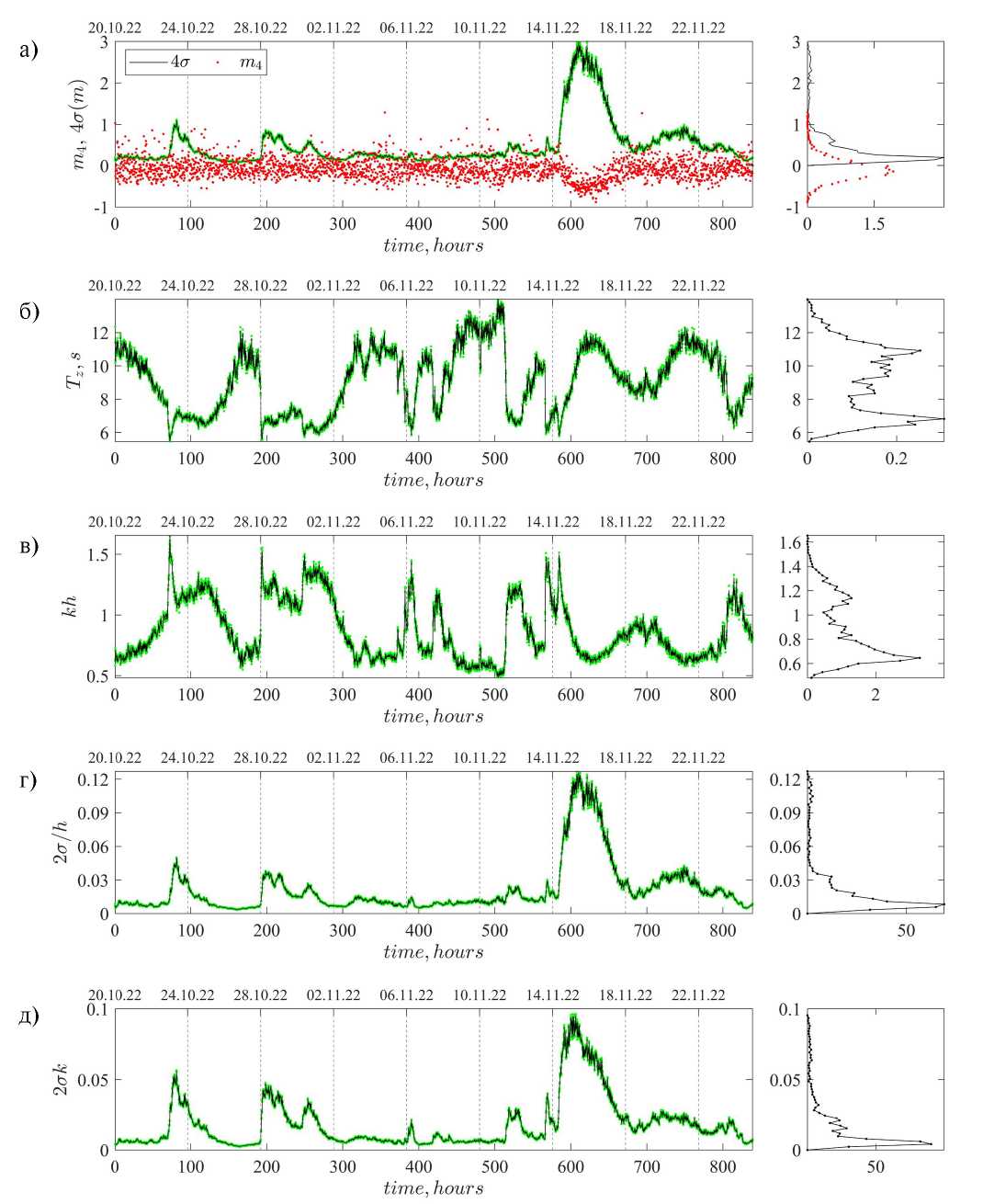 Рис. 4. Изменение параметров волнения во времени: значительная высота 4σ и эксцесс m4 (а), период TZ (б), параметр безразмерной глубины kh (в), параметр мелководной нелинейности 2σ/k (г), крутизна 2σk (д). Зелеными точками построены значения с разных датчиков, черная линия – результат усреднения по датчикам. На диаграммах справа построены плотности распределений вероятностей соответствующих величин.