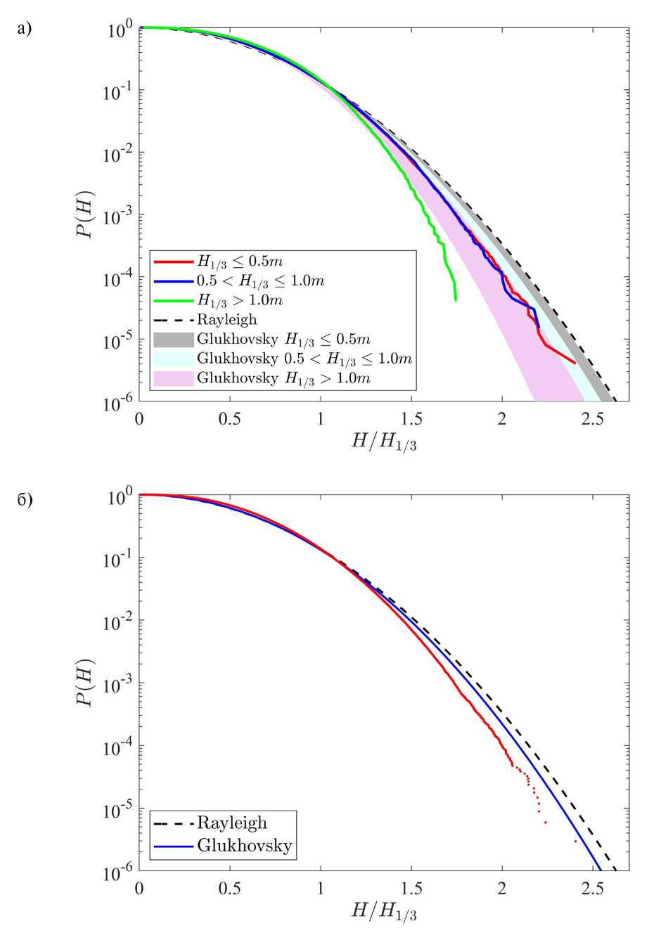 Рис. 5. Распределение вероятностей превышения высот волн H по всем данным измерений (а) и для трех диапазонов H1/3 (жирные линии) (б). Распределения Глуховского (2) на панели (б) построены заливкой для соответствующих диапазонов H1/3. Пунктирной линией построено теоретическое распределение Рэлея.