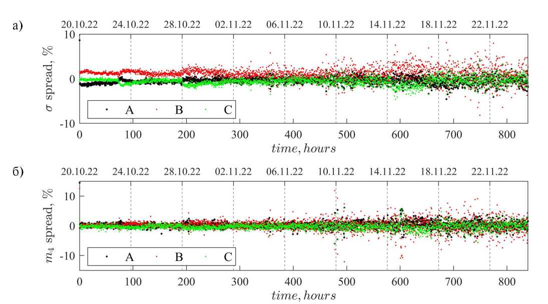 Разброс среднеквадратичных смещений σ по данным с трех приборов относительно их среднего значения приведен на рис. 6а. Каждая точка на графике отражает относительное отклонение значения для одного из приборов (разными цветами) от среднего в 20-минутной выборке. Видно систематическое расхождение значений на ~2% первые примерно 10 сут измерений, которое далее становится менее регулярным и к концу месяца измерений кажется полностью хаотичным в пределах до 10%, с наибольшими отклонениями, соответствующими датчику B.
