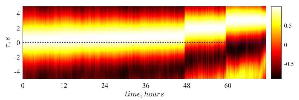 Пример поведения корреляционной функции в области вблизи ее максимума для датчиков A и B в первые три дня показан на рис. 7, где цвет соответствует значениям R(τ). Видны значительные (порядка секунды) моментальные сдвиги максимумов корреляционной функции, начинающиеся после 48 часов измерений, которые оказались проблемой технического характера (пропуск моментов измерений). Сопоставление данных, полученных с датчиков A и C, не выявило подобных ошибок синхронизации, из чего можно сделать вывод, что проблемным оказался только прибор B. В дальнейшем рассинхронизация датчика B нарастает и имеет менее регулярный характер, что ведет к невозможности использования данных с антенны для построения пространственных спектров волн. Потому для этой цели использованы измерения только за первые двое сут. Очевидно, что накопление относительного сдвига временных рядов с разных датчиков вносит вклад в различие оценок волновых характеристик по данным с трех приборов и может объяснять рост разброса значений, наблюдающийся на рис. 6.