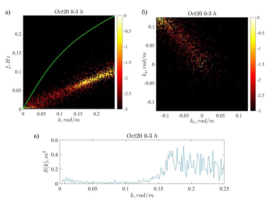 Для построения пространственных спектров использовались выборки данных длиной 512 с (количество точек в Фурье пространстве N = 212) в 3-часовых интервалах с перекрытием 50%. В результате, каждой дискретной частоте (разрешение по частоте 1/512 c ≈ 2 ⋅ 10–3 Гц) соответствует массив спектральных амплитуд с определенными проекциями волнового вектора, модулем волнового вектора и углом, которые накапливаются по дискретным интервалам значений (процедура биннинга). Таким образом строились спектры волновых чисел S(k), спектры направленных волн S(kx,ky), угловые спектры S(θ) и пространственно-временные спектры S(k,ω), которые рассматриваются далее. Все эти функции имеют смысл спектральных плотностей энергии.