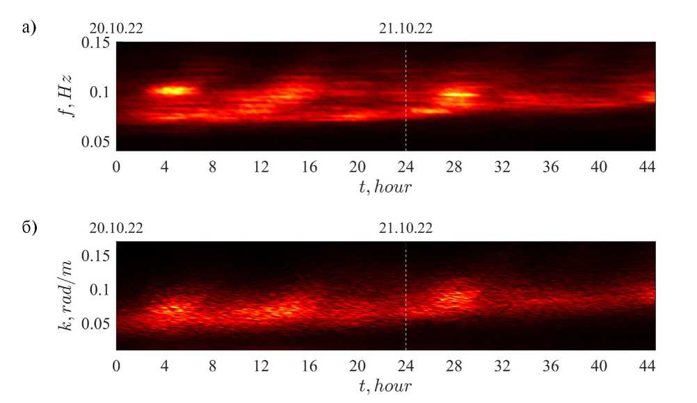 Рис. 10. Эволюция спектров измеренных волн по частотам (а) и волновым числам (б) в первые двое суток измерений (цветом построены спектральные амплитуды в линейном масштабе).