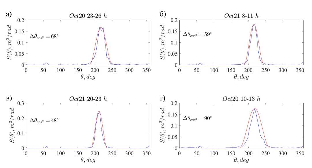 По результатам обработки данных первых двух суток измерений были построены угловые распределения спектральной плотности S(θ), которые оказались с выраженным пиком, соответствующим доминирующему направлению движения волн, см. примеры на рис. 11 (синяя линия). По этим распределениям было определено направление распространения волн как функция времени, а также характерная ширина распределений S(θ). Экспериментальные распределения S(θ) сопоставлялись с теоретической параметризацией cos2: