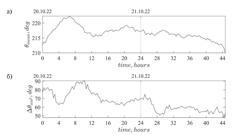 Рис. 12. Доминирующее направление волн (а) и характерная ширина углового спектра ∆θcos2 (б) в течение двух суток измерений.