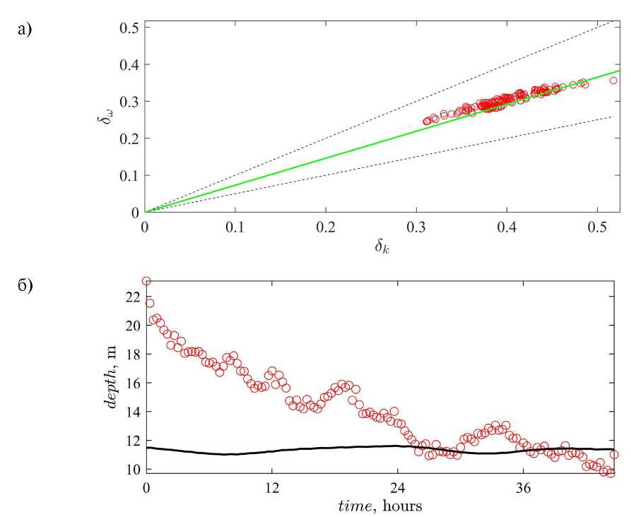 Рис. 15. (а): Соотношение относительных ширин частотного спектра и спектра волновых чисел по данным измерений (значки). Пунктирные линии соответствуют условиям δω = δk (выше) и δω = 1/2 δk (ниже). Сплошная линия: δω = 0.73 δk. (б): Оценка глубины в точке измерения hsp по формуле (12) (символы) и оценка глубины h через среднее в 20-минутных интервалах записи (сплошная линия).