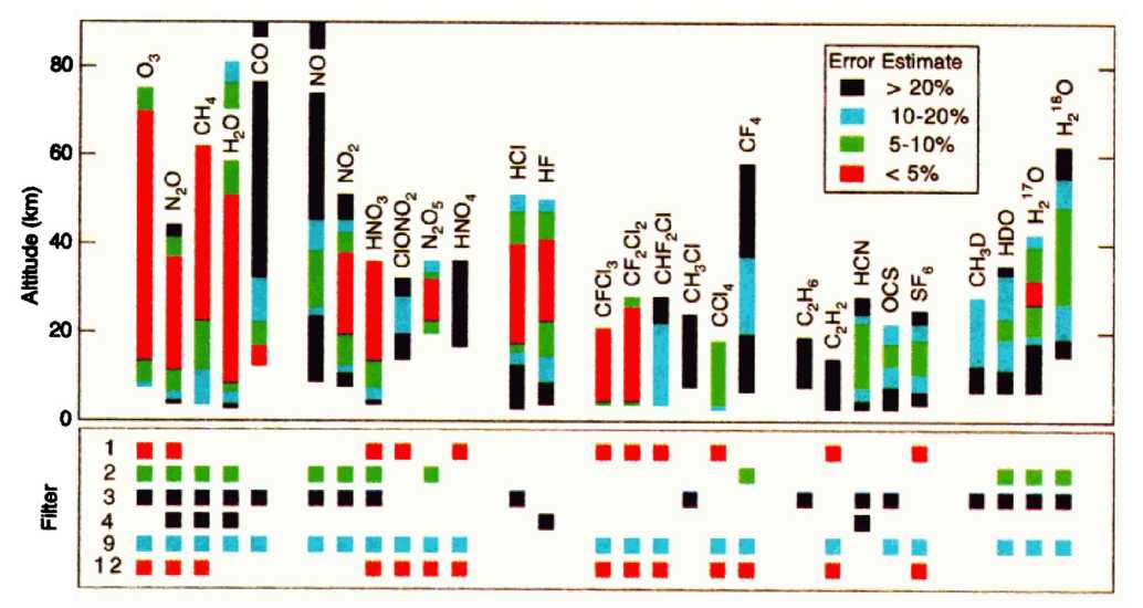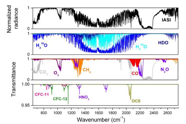 Другими важными факторами, которые обусловливают информативность спутниковых методов определения газового состава атмосферы, являются используемые спектральные области измерений, характеристики применяемой аппаратуры и дистанционных методов. К этим характеристикам относятся спектральное разрешение, случайные и систематические погрешности и угловое разрешение измерений, качество используемой априорной информации, точность задания характеристик молекулярного поглощения, в частности интенсивностей, полуширин спектральных линий и их зависимостей от давления и температуры, контуров линий поглощения и др.