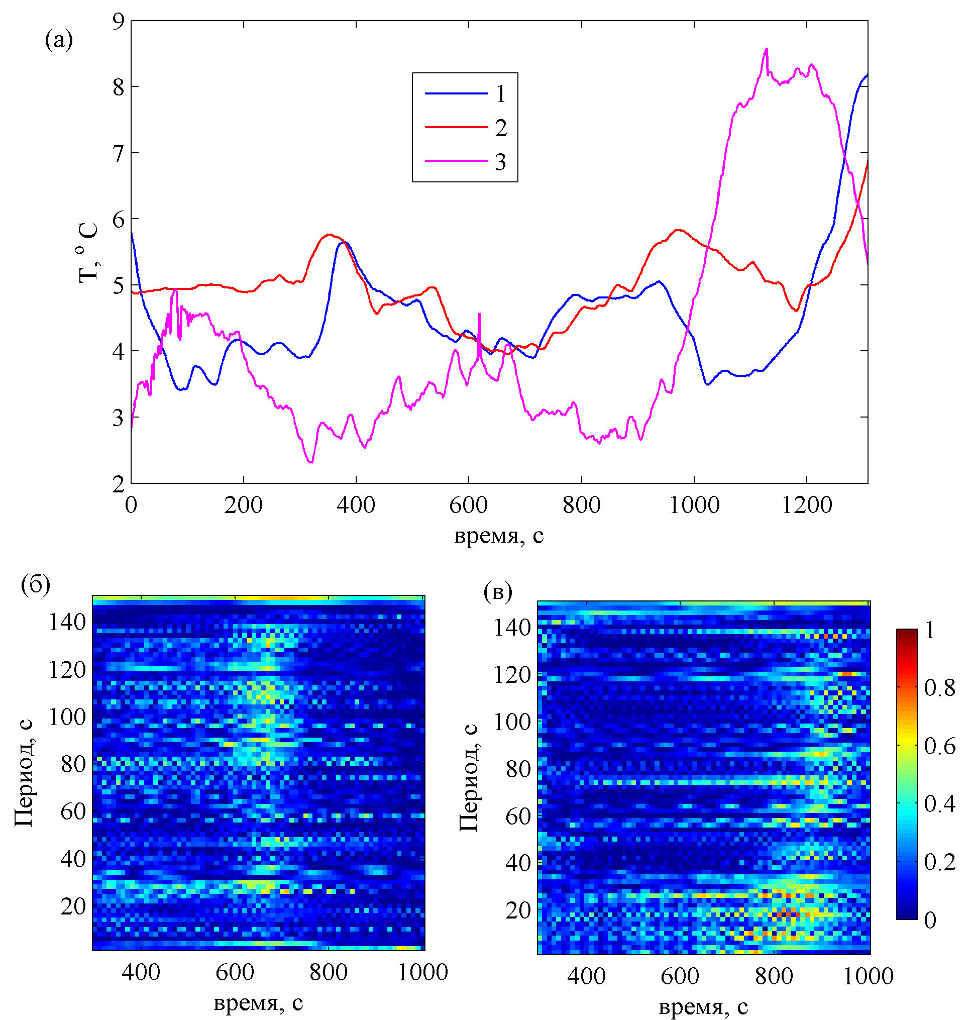 Записи температуры на термодатчиках кос 1, 2 и 3, расположенных на глубине 18 м, показаны на рис. 1а, а взаимные функции когерентности флуктуаций температуры между парами датчиков 1–2 и 1–3 показаны на рис. 1б и рис. 1в, соответственно. Время одновременной работы всех трех кос составило всего 22 мин, что было вызвано сбоем в измерении двумя из трех термокос после 22 мин. Высокие уровни когерентности наблюдались в сравнительно узких частотных полосах во всем рассматриваемом диапазоне периодов от 10 до 160 с. Когерентность достигала максимальных значений в диапазоне периодов 40–160 с в определенные промежутки времени: 600–700 с — для пары 1–2, и 850–950 c — для пары 1–3.