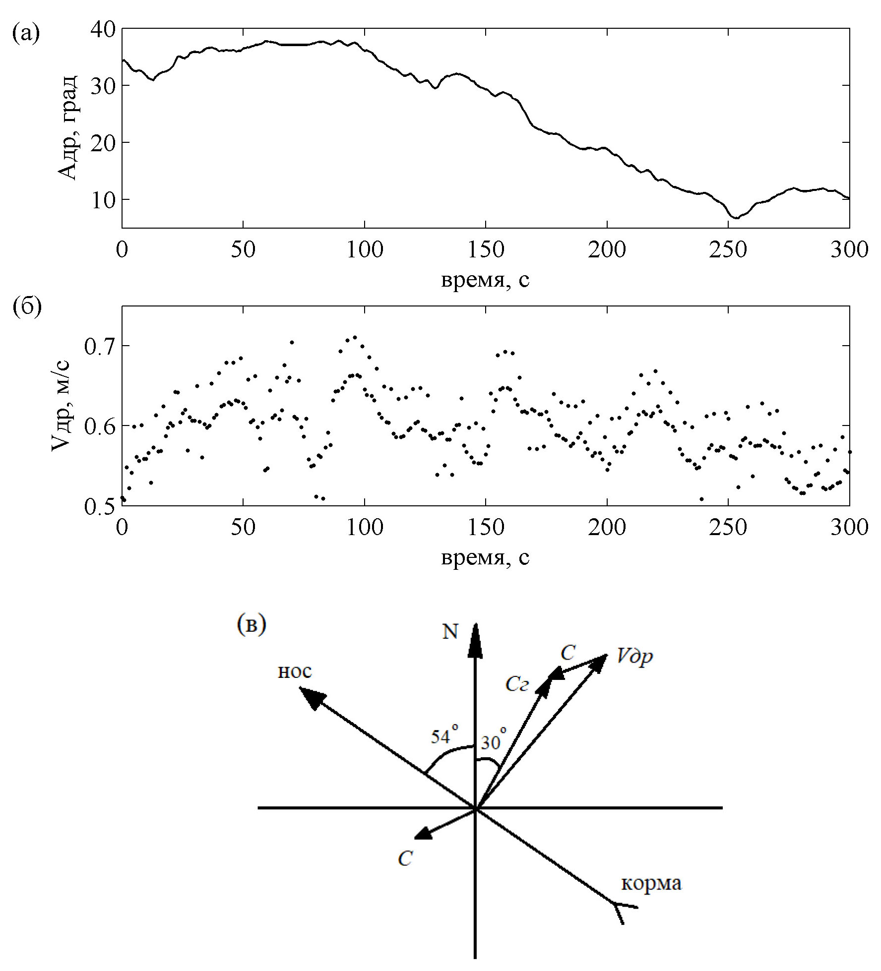 Направление и скорость дрейфа судна в течение промежутка времени 400–700 с, когда были определены направление и скорость распространения волн на рис. 2б и рис. 2в (т.е. в течение 300 с) показаны на рис. 3а и рис. 3б, соответственно. Схематически на рис. 3в показаны также: направление оси судна от кормы к носу, направление его дрейфа со скоростью c азимутом примерно 36° в промежутке времени от 400 до 500 с, и горизонтальной фазовой скорости волн относительно дрейфующего судна, распространяющейся с северо-востока на юго-запад с азимутом примерно в 234°.
