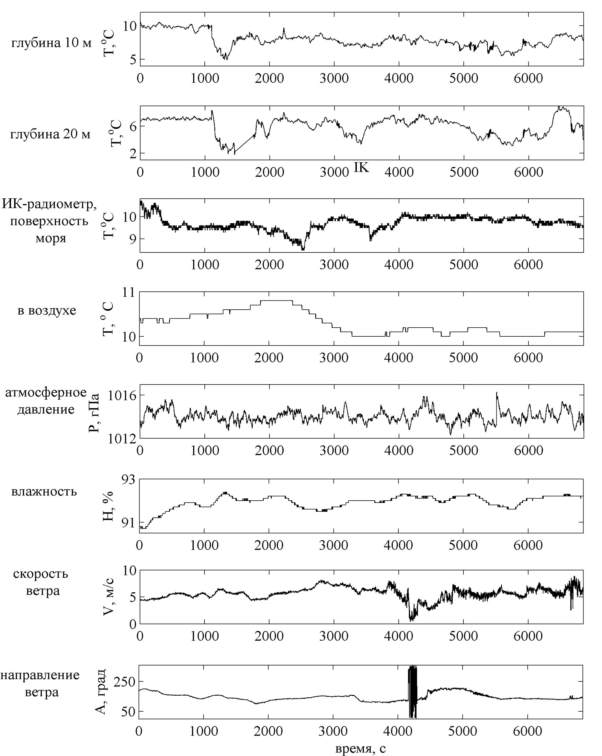 На рис. 4 показаны измеренные 12.08.2021 в течение 1.9 ч от момента времени 11:00 UTC вариации температуры морской воды на глубинах 10 и 20 м с помощью термокос на станции 3911 (дискретность измерений — 1 с) и температуры поверхности моря (ТПМ) с помощью ИК-радиометра одновременно с вариациями температуры воздуха, атмосферного давления, влажности, скорости и направления ветра. Взаимные амплитудные кросс-спектры между этими флуктуациями (кроме влажности) показаны на рис. 5.