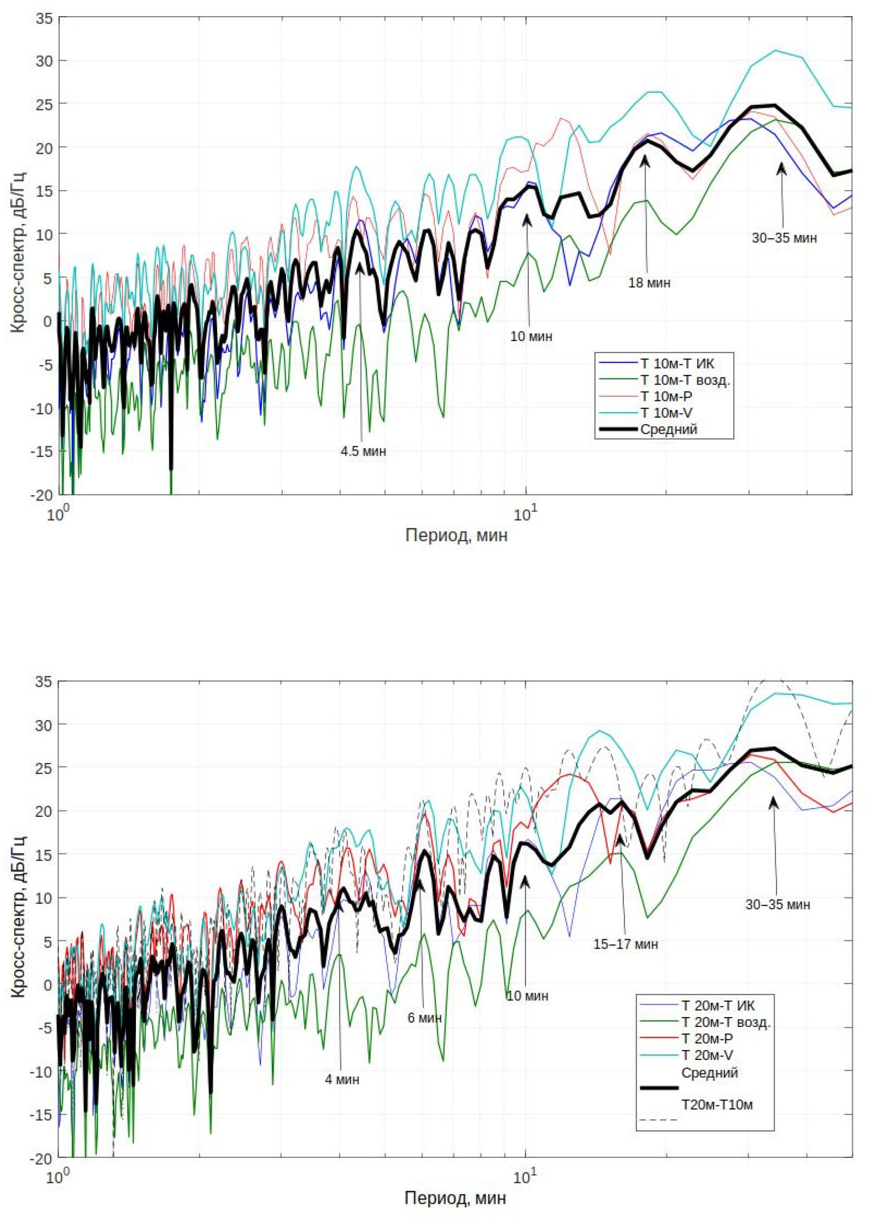 На взаимных кросс-спектрах (рис. 5а) между флуктуациями температуры воды на глубине 10 м (Т10м) и флуктуациями атмосферного давления (P), температуры Т10м и скорости ветра (V), температуры Т10м и температуры поверхности моря Tик, температуры Т10м и температуры воздуха (Tвозд), полученных для реализаций флуктуаций длиной в 1.9 ч, обнаруживаются общие спектральные максимумы на периодах, близких к 4 мин, 10 мин, 18 мин и 35 мин (указаны вертикальными стрелками). Почти такие же периоды характерны и для максимумов кросс-спектров между флуктуациями температуры воды на глубине 20 м (Т20м) и флуктуациями метеопараметров (рис. 5б), а также между флуктуациями температуры воды на глубинах 10 м (Т10м) и 20 м (Т20м) (пунктирная линия).