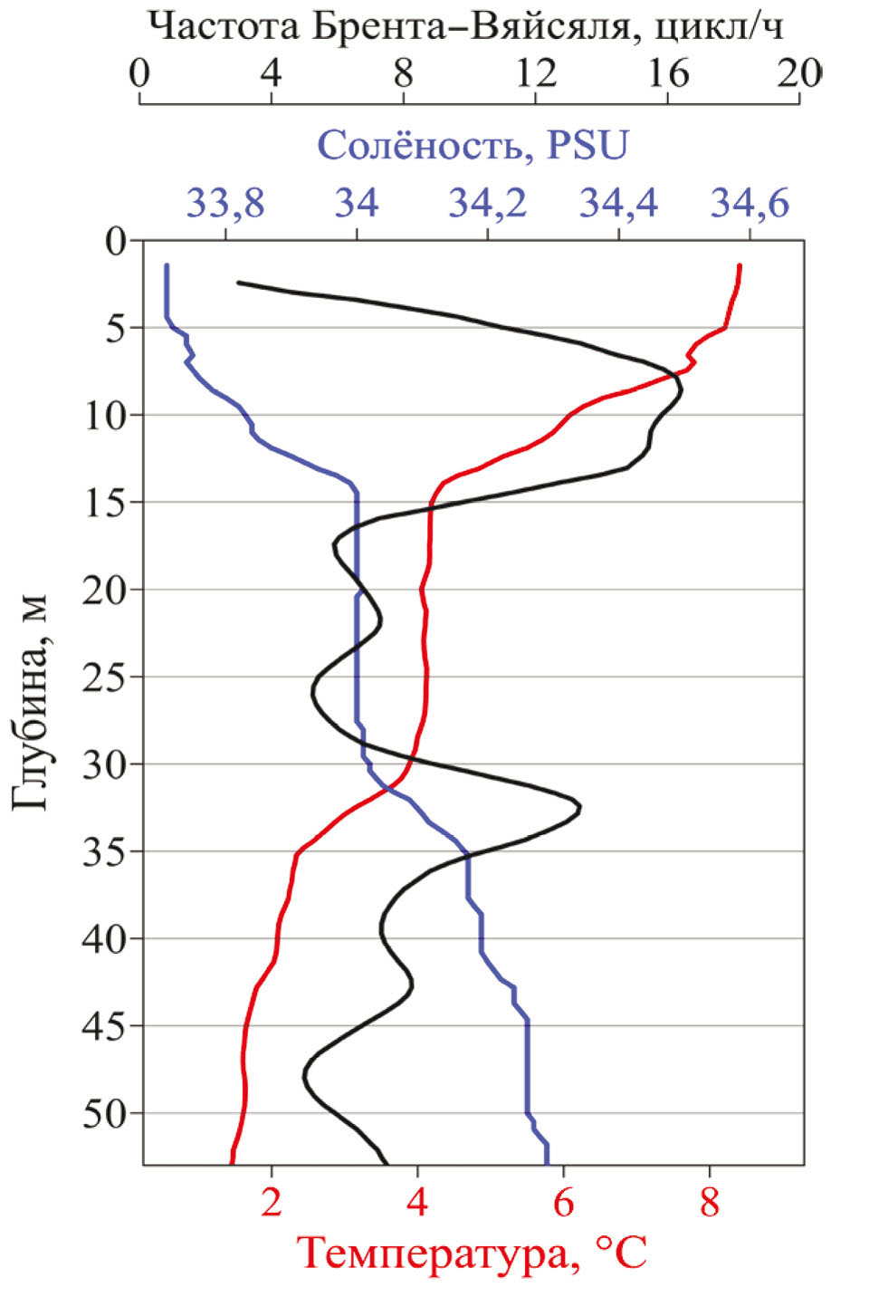 Для периода проведения измерений 12.08.2021 вертикальные профили температуры, солености и частоты БВ показаны на рис. 6. Анализ профиля частоты БВ N(z), приведенного в [Kozlov et al., 2023], показывает, что в слое до глубины 20 м частота N(z)/(2π) в ее вертикальном профиле доcтигает максимума на глубине 8–10 м и составляет примерно 17 циклов/ч, а соответствующий минимальный период БВ — около 3,5 мин. С ростом глубины до 20 м, частота N(z)/(2π) падает до ее минимального значения 4–5 циклов/ч, что соответсветствует максимальному периоду БВ в 12–15 мин. Наоборот, при уменьшении глубины до глубины верхнего тонкого перемешанного слоя, стратификация внутри этого слоя становится почти нейтральной (N2(z) = 0).