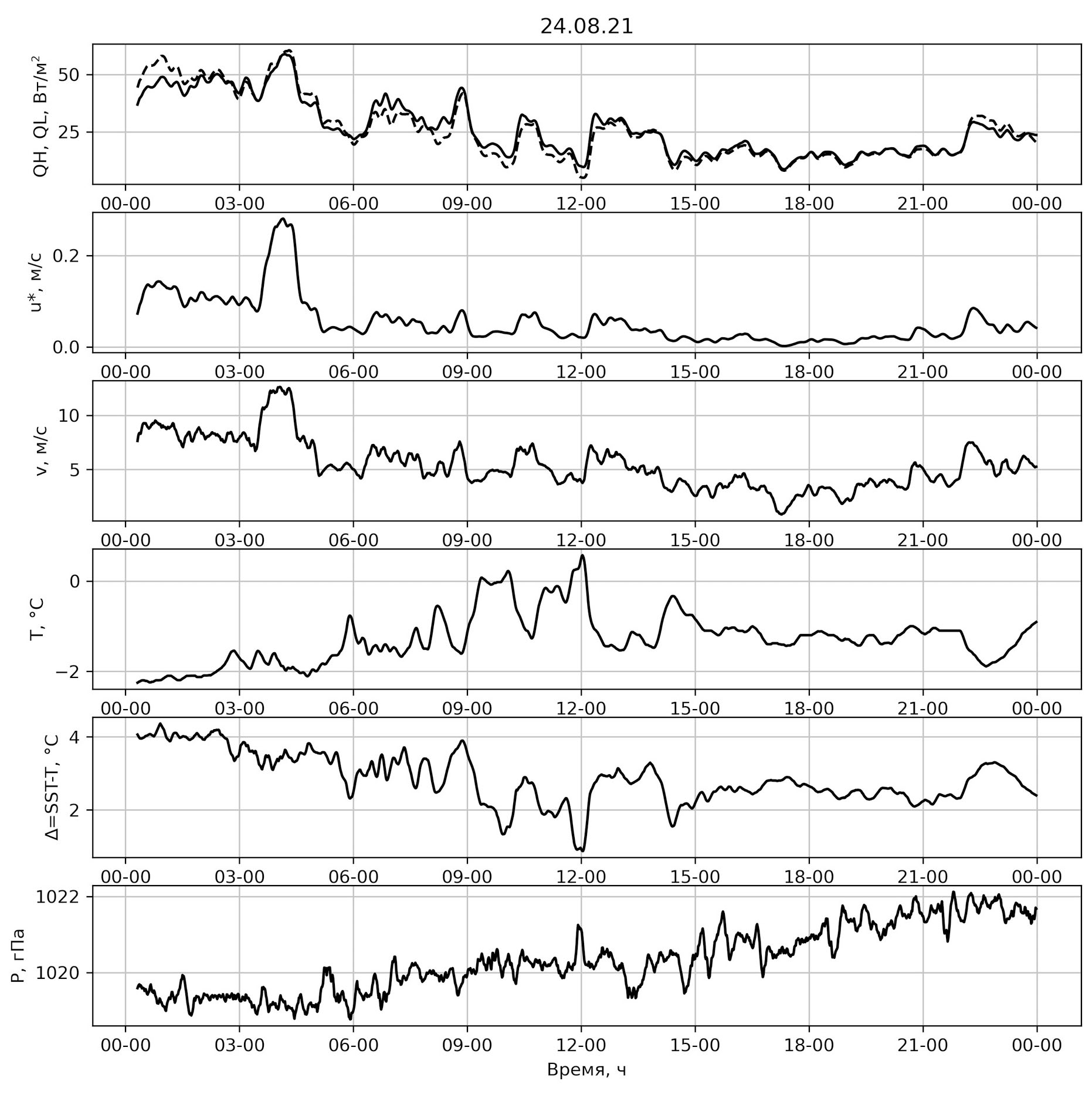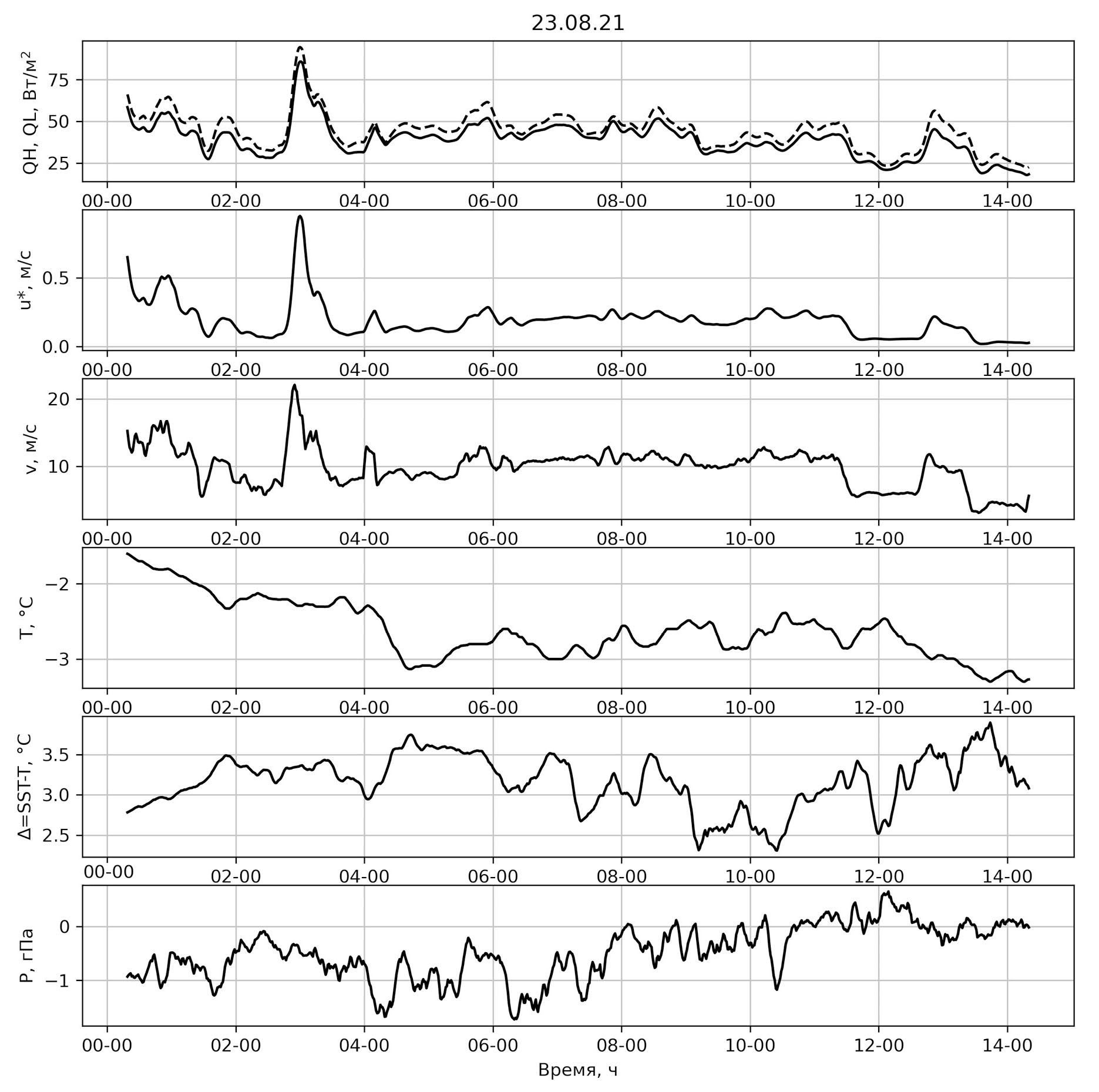 На рис. 7 показаны полученные 23.08.2021 г. в течение 14 часов мезомасштабные вариации турбулентных потоков явного (QH) и скрытого тепла (QL), динамической скорости u*, а также осредненные за 10 мин горизонтальная скорость ветра V, температура воздуха (temp), разность температур моря и воздуха (delta) и атмосферное давление (P), полученные по данным метеостанции. Эти вариации получены относительно движущегося судна со средней скоростью в этот день примерно в 1.5 узла или 0.8 м/с.
