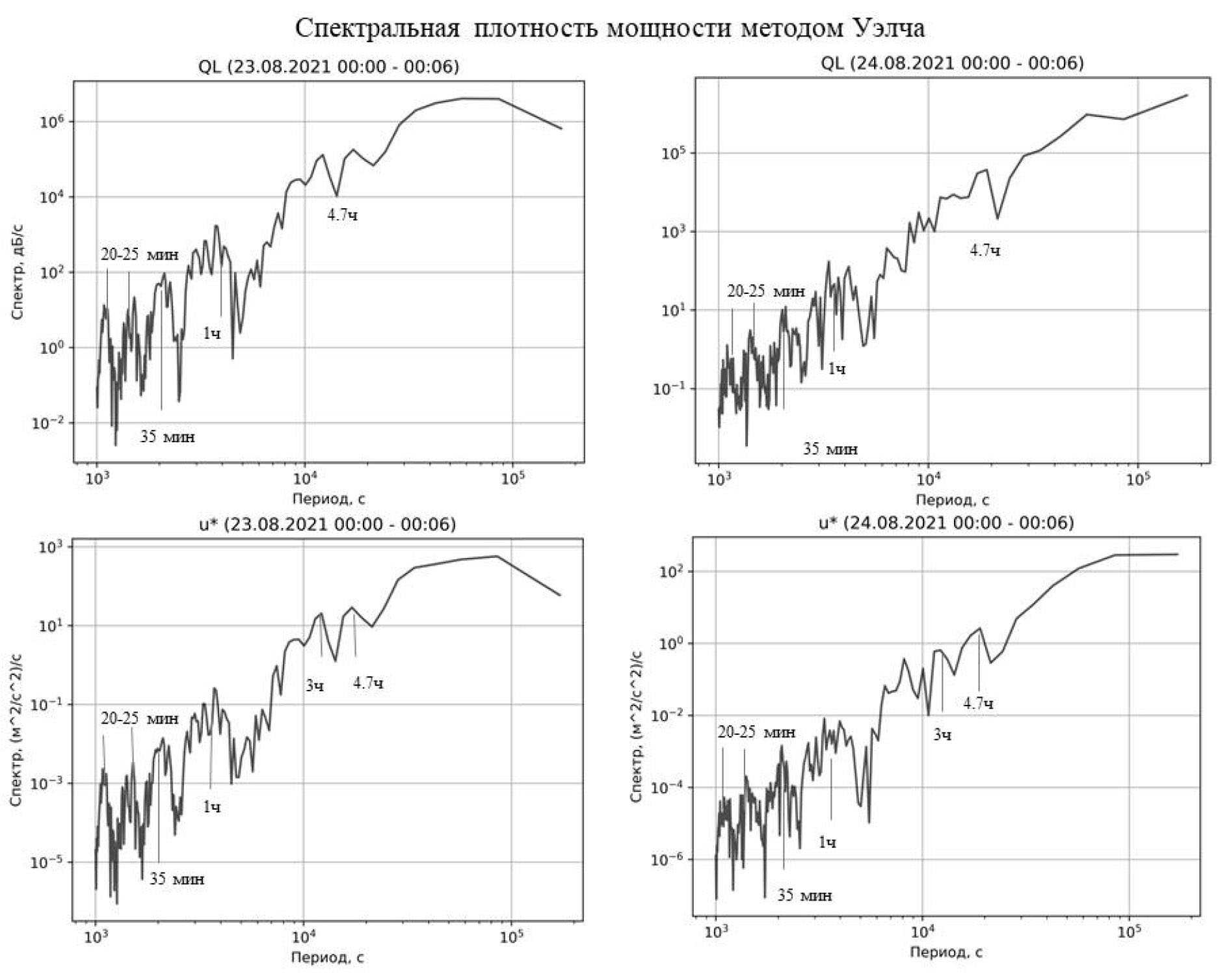Аналогичное влияние мезомасштабных вариаций вертикального сдвига скорости ветра и разности температур (delta) на динамическую скорость u* и вертикальные турбулентные потоки тепла, соответственно, наблюдалось также и 24.08.2021 г. (рис. 8). Основные периоды этих мезомасштабных вариаций были определены из временных спектров вариаций динамической скорости u* и турбулентных потоков тепла QL, полученных 23.08.2021 г. (рис. 9, слева) и 24.08.2021 г. (рис. 9, справа) в ночной промежуток времени с 00:00 до 06:00 UTC.