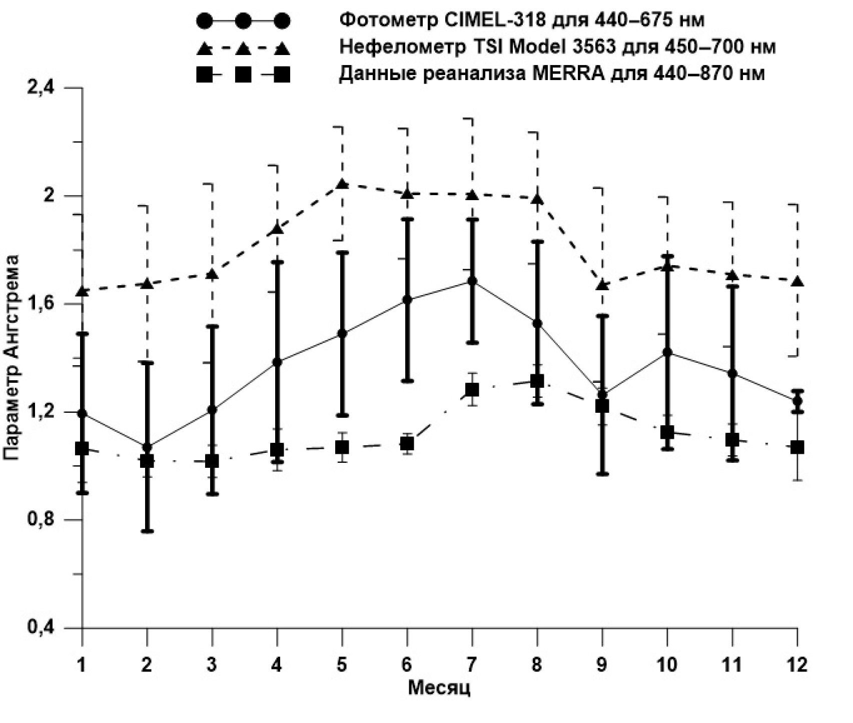 Как в результатах наземных измерений, так и в данных реанализа наблюдается межсезонная изменчивость, характеризуемая низкими значениями показателя Ангстрема в холодное время года и высокими — в теплое. Для данных MERRA-2, по сравнению с данными измерений фотометра и нефелометра характерна наименьшая амплитуда как среднемесячных значений, так и сезонной изменчивости показателя Ангстрема. Данные измерений нефелометра систематически превышают данные реанализа. Вероятно, это объясняется тем, что данные реанализа MERRA-2, основу которых составляют результаты глобальных спутниковых измерений, имеют более грубое пространственное и временное разрешение. В нефелометрических измерениях коэффициентов аэрозольного рассеяния анализируются пробы приземного воздуха, и соответствующие им наблюдения носят локальный и непрерывный характер. Среднемесячные значения, рассчитанные по данным MERRA-2 и полученные на основе измерений фотометром CIMEL имеют близкие среднегодовые значения. Оба источника данных несут информацию о содержании аэрозольных частиц во всей толще атмосферы с учетом полного спектрального ослабления солнечного излучения. Наибольшие расхождения наблюдаются с мая по июль. Стоит также отметить и различия в интервалах длин волн, используемых для расчетов анализируемого показателя Ангстрема, у наземных приборов он уже (максимум 440–700 нм).