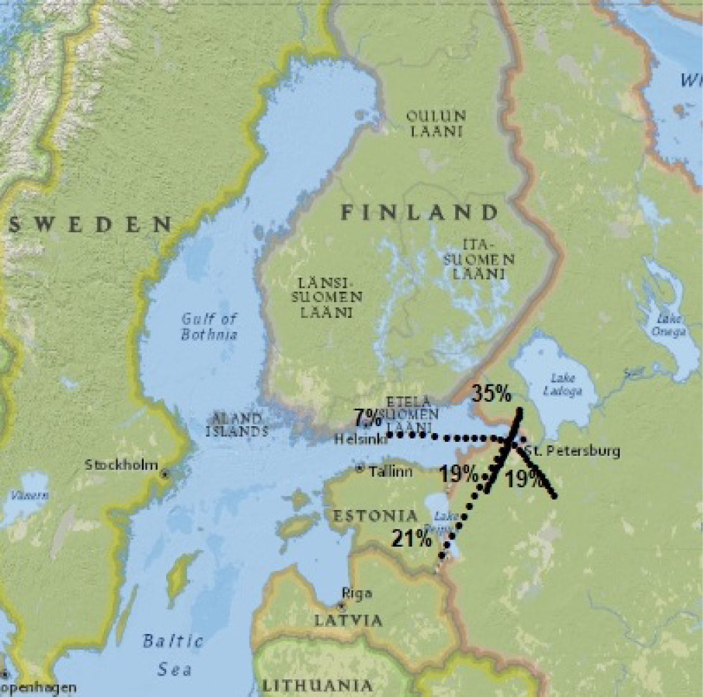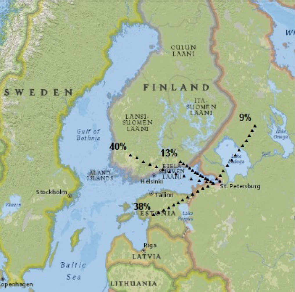 Рис. 4 представляет средние воздушные траектории с их процентным распределением по направлениям для тех дней наблюдений, когда параметр Ангстрема рассеяния по данным измерений нефелометра оказался меньше 1 (4% всех измерений). Данные измерений и расчетное время прихода воздушных масс в точку наблюдений соответствуют 12 часам UTC. В 80% дней измерений низкие значения (αS 450(700) <1) сопровождаются минимальными значениями измеренных коэффициентов полного и обратного рассеяния. Средняя величина σsp(550) составила для этой выборки данных 6.16 ± 2.22, а среднее значение σbsp(550) — 0.86 ± 0.32. В кривых траекторий выделяется 2 основных направления, юго-западное и северо-западное, соответствующие акватории Балтийского моря (вместе они описывают 91% от всех траекторий). Согласно расположению представленных на рисунке начальных точек обратных траекторий, в ансамбле отсутствуют воздушные массы восточного и южного секторов направлений. Морская поверхность, являющаяся естественным источником легко растворимых и гигроскопических аэрозольных частиц радиусом до десятков мкм, одновременно удалена от источников промышленных выбросов вторичного мелкодисперсного аэрозоля. Поэтому для воздушных масс, приходящих с удаленных морских акваторий, характерно преобладание крупнодисперсного аэрозоля, подтверждающееся низкими значениями параметра Ангстрема рассеяния.