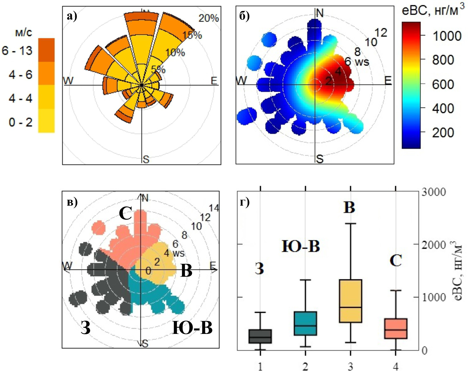 За время наблюдений высокие концентрации черного углерода (более 800 нг/м3) наблюдались при застойной погоде (ws менее 1 м/с), в направлениях ветров восточного, северо-восточного и юго-восточного направлений (ws более 1 м/с) (рис. 2б). Концентраций более 300 нг/м3 не зарегистрировано при ws выше 2 м/с в восточном и 4 м/с в северном и южном направлениях. Анализ двумерного распределения еВС по направлению и скорости ветра выделил четыре кластера (рис. 2в), данные статистической обработки которых представлены на рисунке 2г). Кластеры восточный (В), юго-восточный (Ю-В), северный (С), а также западный (З) характеризуются наивысшим 800, 260, 380 нг/м3 и наименьшим 240 нг/м3 медианными значениями, соответственно. Географическое местоположение секторов, определенных кластерным анализом указано на рис. 1. Направление источников (наивысших концентраций) черного углерода определяется в восточном секторе, где расположены объекты инфраструктуры ТЭК УНГКМ. Наивысшие концентрации еВС более 1000 нг/м3, измеренные при скоростях ветра в диапазоне более 2 м/c (рис. 2б), указывают на удаленный источник в этом направлении. В секторах (С) спального района города и (Ю-В) многофункциональной городской зоны определяются средние уровни загрязнения черным углеродом. В секторе (З) минимальных концентраций оказался юго-западный район города и незаселенный лесотундровый ландшафт.