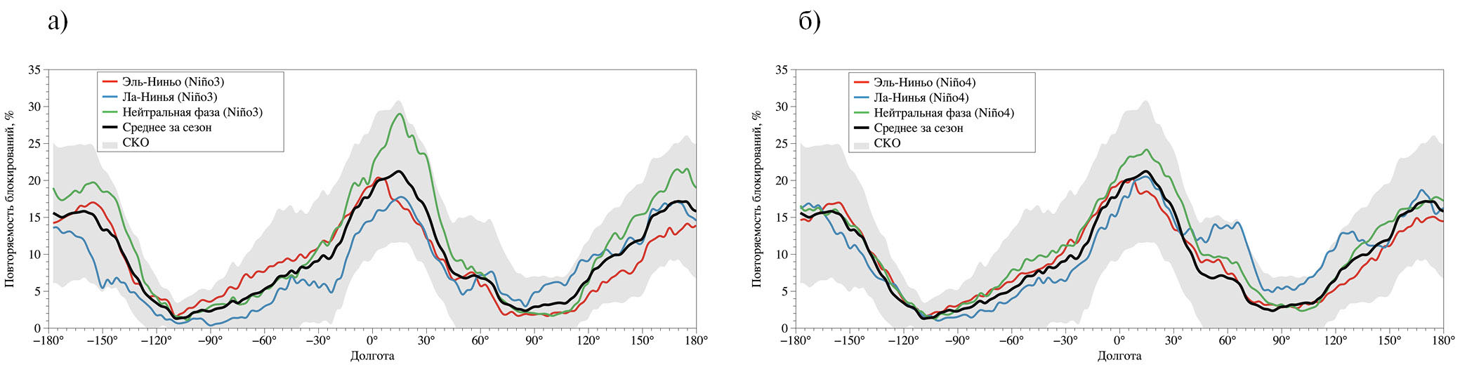 В [Renwick, Wallace, 1996], в частности, по данным для 44 зим (1950–1994 гг.) получено, что повторяемость атмосферных блокирований зимой над Тихим океаном в Северном полушарии существенно больше в фазе Ла-Нинья, чем в фазе Эль-Ниньо. Учитывался также эффект Тихоокеанско-Североамериканского колебания (моды). Общая продолжительность атмосферных блокирований за год в Северном полушарии в целом, а также над Тихоокеанским сектором, согласно оценкам, полученным в [Wiedenmann et al., 2002] по данным реанализа для периода 1968–1998 гг., наибольшая в годы Ла-Нинья, а наименьшая в годы Эль-Ниньо (см. также [Мохов, 2006]). При этом над континентами в целом общая продолжительность атмосферных блокирований за год наибольшая при нейтральной фазе, тогда как над атлантическим сектором — минимальная.