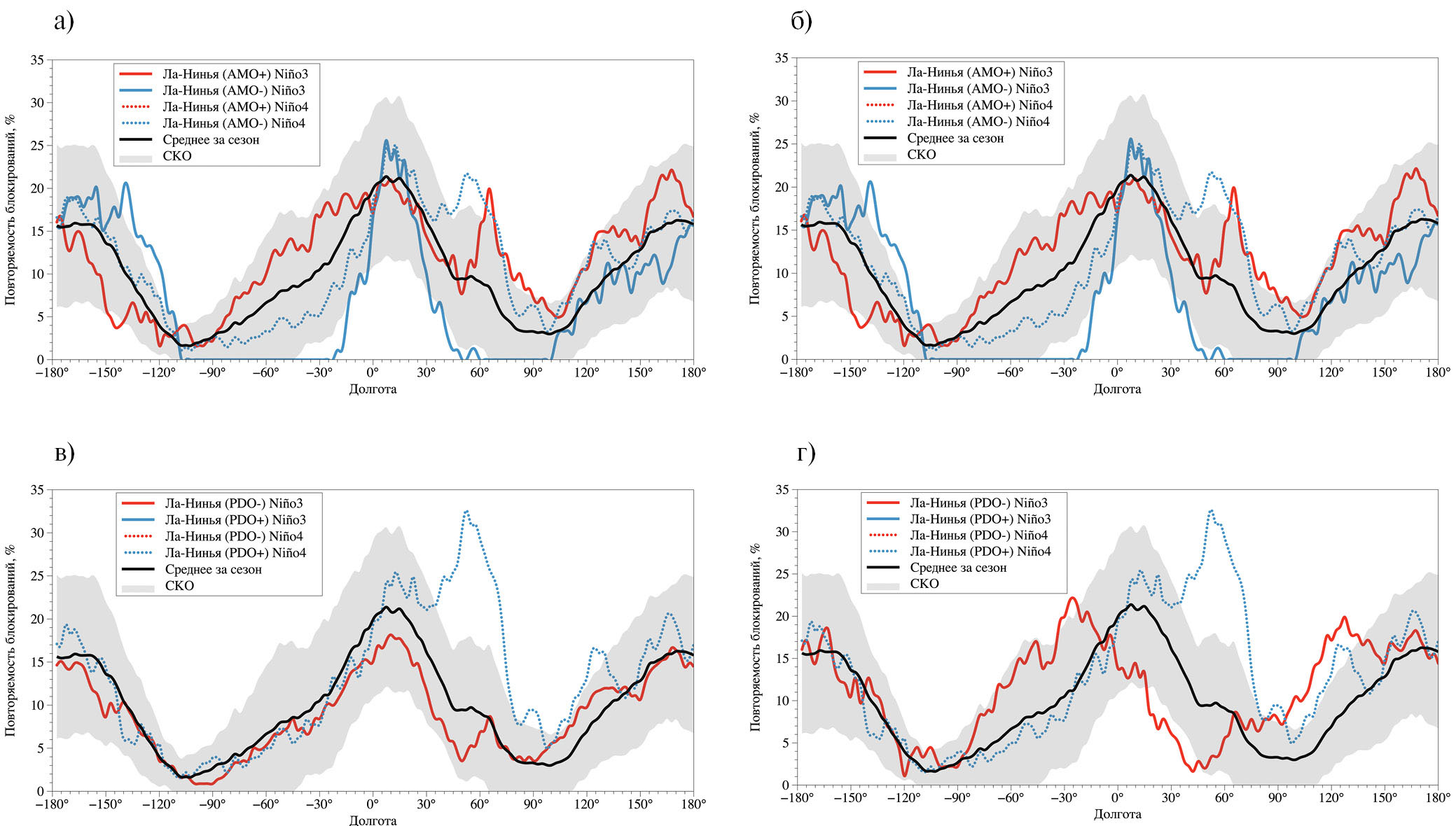 Отмечено, что в нейтральной фазе Эль-Ниньо повторяемость атмосферных блокирований в области зимних максимумов в Евро-Атлантическом и Тихоокеанском секторах существенно больше средних значений для периода 1979–2018 гг. при положительной фазе PDO, а также в области зимнего максимума в Тихоокеанском секторе при отрицательной фазе АМО. В фазе Эль-Ниньо отмечено, в частности, существенное увеличение повторяемости атмосферных блокирований над Тихим и Атлантическим океанами в отрицательной фазе Тихоокеанской десятилетней осцилляции, а также в положительной фазе Атлантической мультидесятилетней осцилляции. Значительное увеличение повторяемости атмосферных блокирований зимой отмечено в фазе Ла-Нинья (при использовании индекса Nino4) в области Уральских гор в положительной фазе PDO и отрицательной фазе АМО.