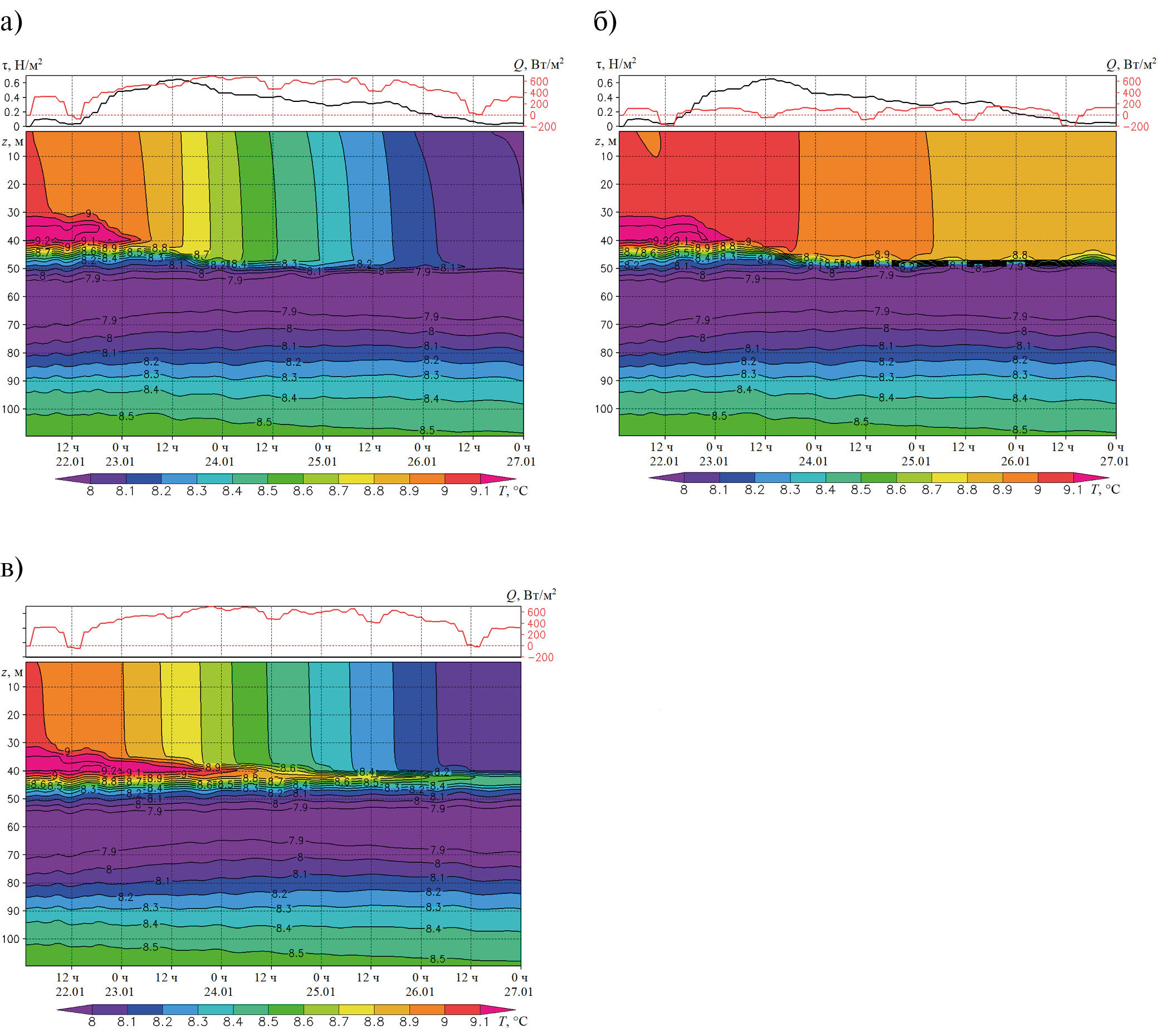 Из рис. 4б видно, что в эксперименте 1 (с отключением потоков тепла) понижение температуры ВКС составило всего около 0.2 °С. Однако, при этом толщина ВКС, как и в основном расчете, увеличилась на 20 м, до глубины 50 м, из-за перемешивания, обусловленного как обрушением ветровых волн, так и сдвиговой неустойчивостью ветровых течений. Этот механизм хорошо известен и наиболее ярко проявляется на малых глубинах в ходе осеннего заглубления ВКС. Кроме того, после холодного вторжения сохранился ХПС с хорошо выраженной верхней границей (рис. 4б). В основном расчете ХПС к концу моделирования вырождается, с 27 января сливается с ВКС (рис. 4а). На рис. 4б хорошо виден небольшой суточный ход потока тепла между морем и атмосферой: днем море нагревается за счет приходящей коротковолновой радиации, ночью — охлаждается за счет потока длинноволновой радиации.
