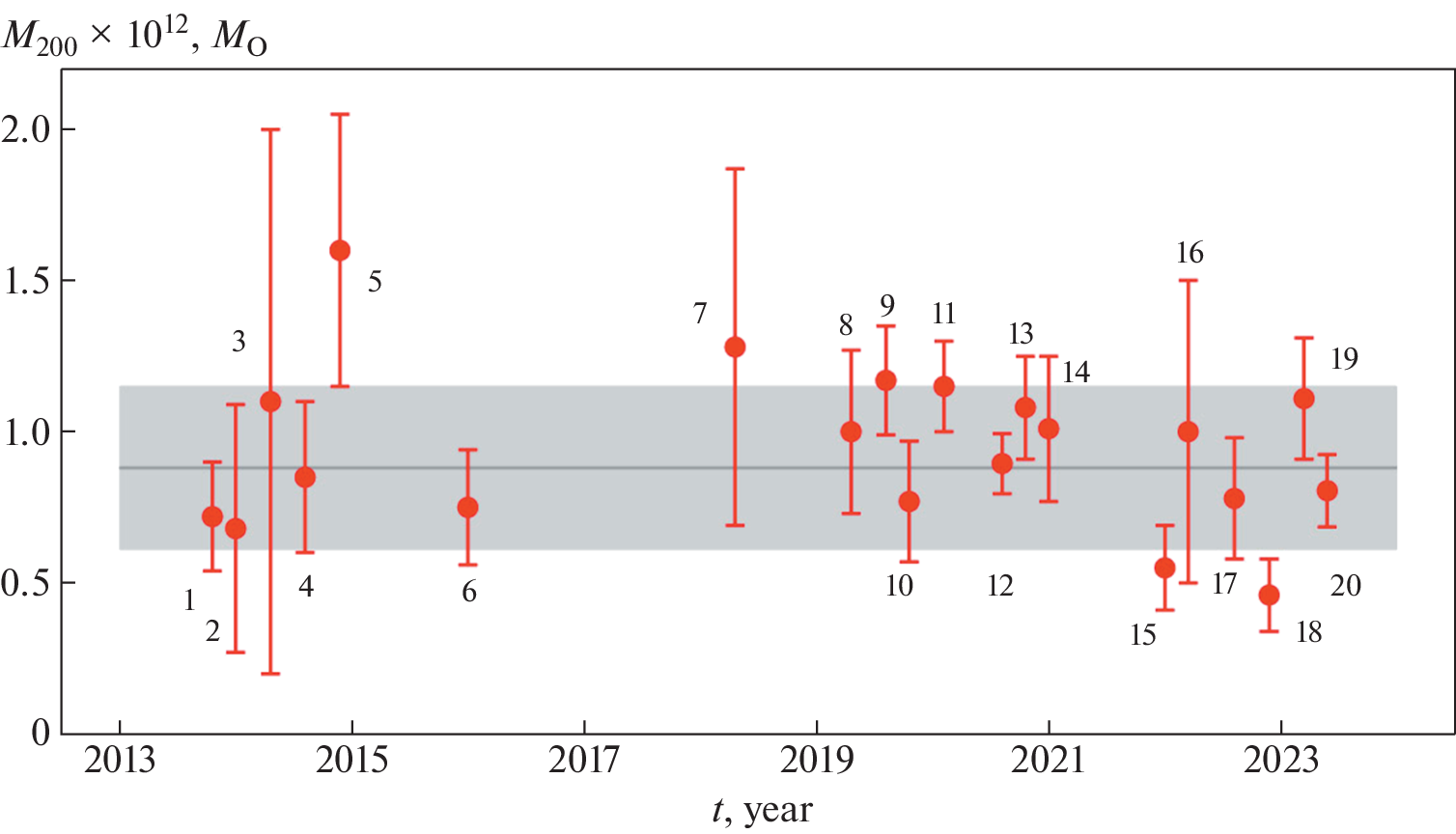 An overview of various methods used to estimate the mass of the Galaxy is given. The results obtained on the basis of the analysis of the galactic rotation curve, on the kinematics of dwarf satellite galaxies of the Milky Way, on globular clusters, on the streams of dwarf galaxies, on distant halo stars, on escape velocities, on the dynamics of the Local group of galaxies, as well as results of N-body modeling are included. Estimates of the mass of the Galaxy \(M\) of the form (i) \(M( < r)\), i.e. the mass enclosed inside a sphere with a radius of \(r\), (ii) \({{M}_{{200}}}\), where r 0 kpc, and (iii) virial estimates, \({{M}_{{{\text{vir}}}}}\). Such estimates were selected by us based on literary data,a significant part of which was obtained in the Gaia era. According to 20 individual estimates, the average value was found \({{\bar {M}}_{{200}}} = 0.88 \times {{10}^{{12}}} {{M}_{ \odot }}\) with a variance of \(0.24 \times {{10}^{{12}}} {{M}_{ \odot }}\) and a weighted average error of \(0.06 \times {{10}^{{12}}} {{M}_{ \odot }}\). According to 28 individual estimates we obtained \({{\bar {M}}_{{{\text{vir}}}}} = 1.05 \times {{10}^{{12}}} {{M}_{ \odot }}\) with variance \(0.44 \times {{10}^{{12}}} {{M}_{ \odot }}\) and a weighted average error of \(0.09 \times {{10}^{{12}}} {{M}_{ \odot }}\).