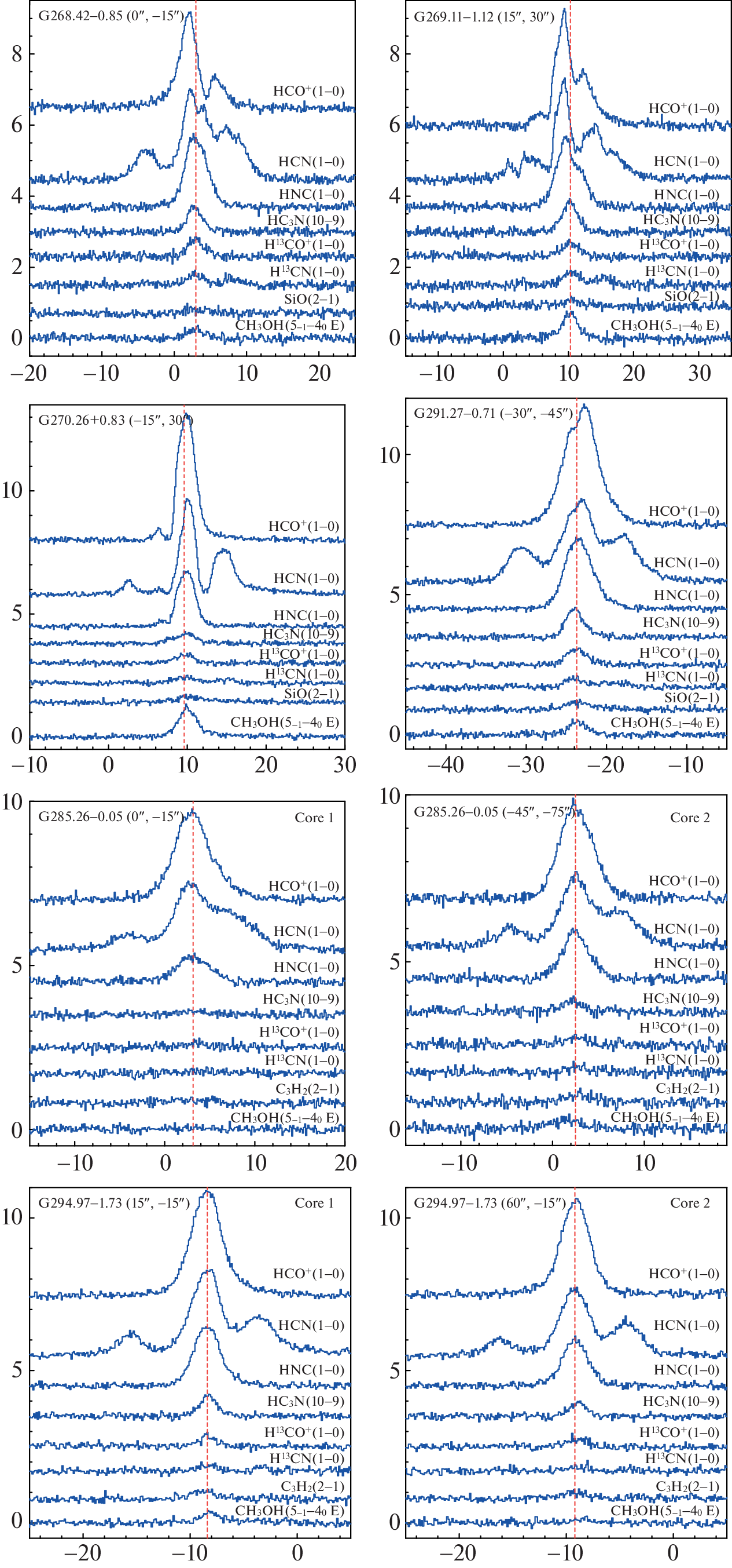 The results of spectral observations in the \( \sim {\kern 1pt} 84{\kern 1pt} - {\kern 1pt} 92\) GHz frequency range of six objects from the southern sky having dense cores and associated with massive star and star cluster forming regions are presented. The observations are carried out with the MOPRA-22m radio telescope. Within the framework of the local thermodynamic equilibrium (LTE) approximation, column densities and abundances of the H13CN, H13CO+, HN13C, HC3N, c-C3H2, SiO, CH3C2H and CH3CN molecules are calculated. Kinetic temperatures (\( \sim 30{\kern 1pt} - {\kern 1pt} 50\) K), sizes of emission regions (\( \sim 0.2{\kern 1pt} - {\kern 1pt} 3.1\) pc) and virial mass esimates (\( \sim 70{\kern 1pt} - {\kern 1pt} 4600{\kern 1pt} {{M}_{ \odot }}\)) are obtained. The linewidths in the three cores decrease with increasing distance from the center. Four cores exhibit asymmetry in the profiles of the optically thick HCO+(1–0) and HCN(1–0) lines, indicating the presence of systematic motions in the line of sight. In two cases, the asymmetry can be caused by contraction of gas. The model HCO+(1–0) and H13CO+(1–0) spectral maps obtained within the non-LTE spherically symmetric model are fitted into observed ones. Radial density (\( \propto {\kern 1pt} {{r}^{{ - 1.6}}}\)), turbulent velocity (\( \propto {\kern 1pt} {{r}^{{ - 0.2}}}\)) and contraction velocity (\( \propto {\kern 1pt} {{r}^{{0.5}}}\)) profiles in the G268.42–0.85 core are obtained. The contraction velocity radial profile differs from expected both in the case of free fall of gas onto a protostar (\({{r}^{{ - 0.5}}}\)), and in the case of global core collapse (contraction velocity does not depend on distance). A discussion of the results obtained is provided.