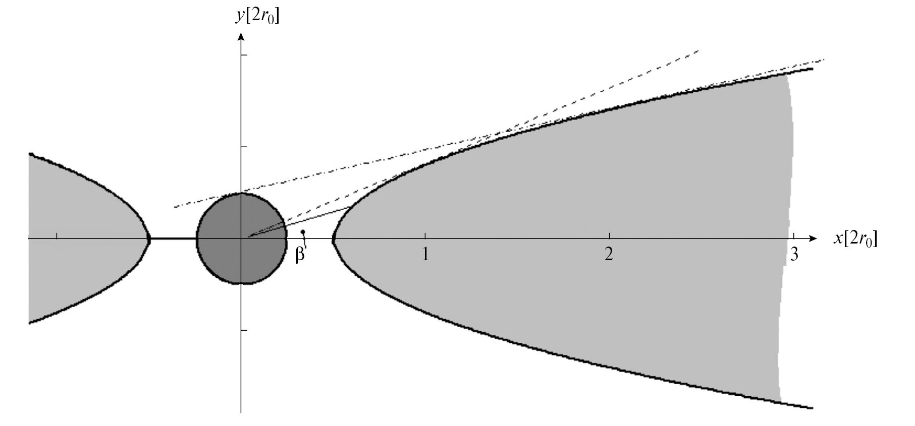 Поскольку координаты экрана состоят только из переменных метрики 2-сферы ЧД (см. ур-е (1)), форма экрана (огибающая зоны, закрашенной светло-серым на рис. 1) может быть параметризована следующим образом: