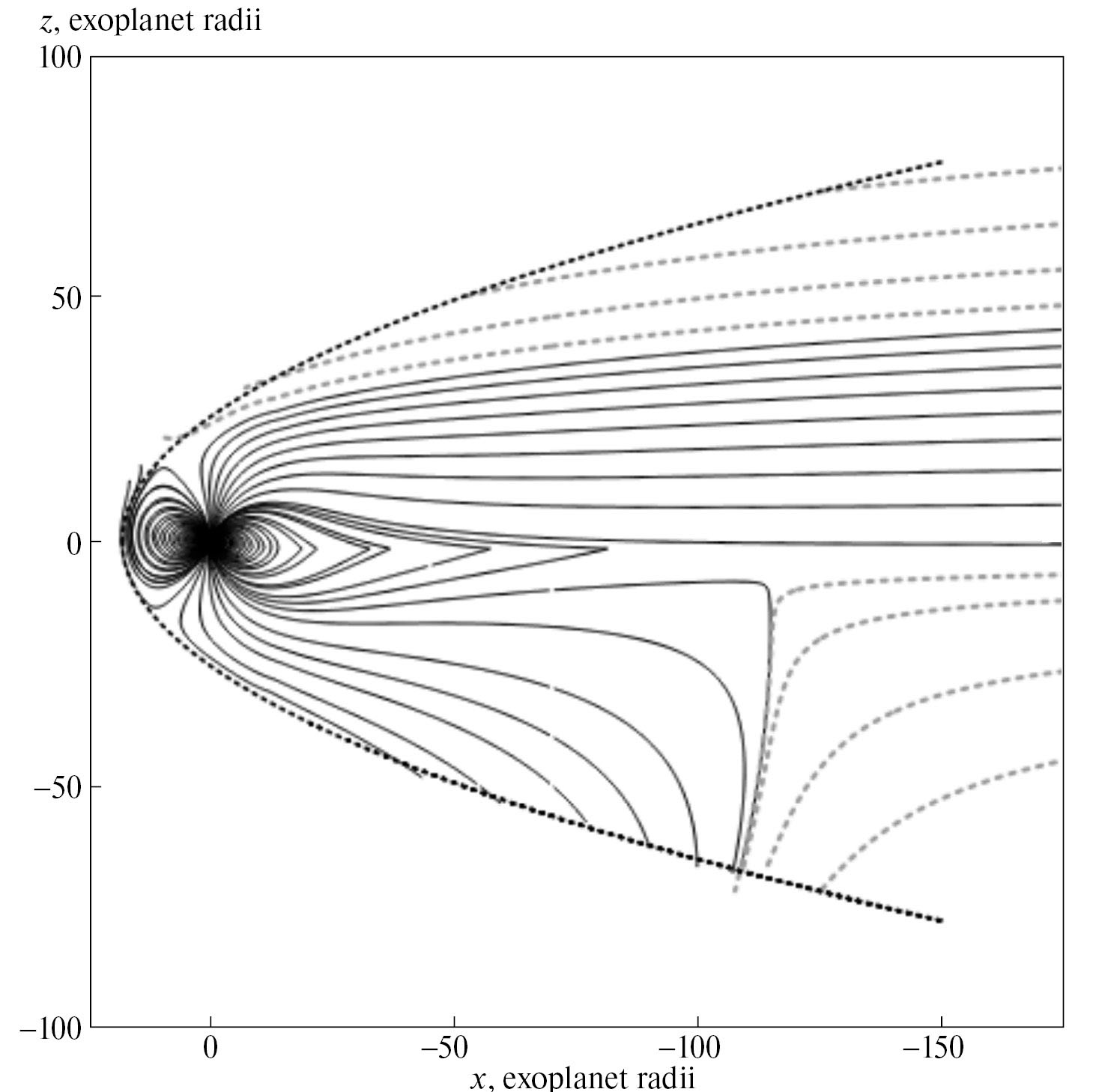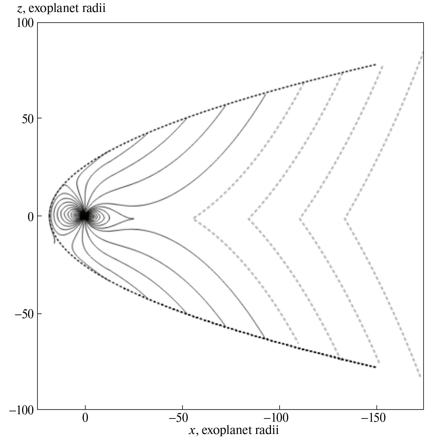 Рис. 2. То же, что на рис. 1, но для ММП с компонентами {0, 0, 38} нТл. Открытая магнитосфера HAT-P-11b для умеренного северного ММП. Штриховые линии на всех рисунках обозначают линии межпланетного магнитного поля, проникшие в магнитосферу (показана пунктиром).