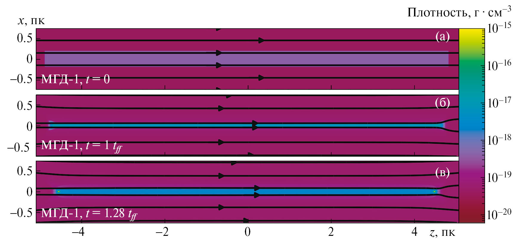 На рис. 2 приведены срезы плотностей в плоскости x - ɀ для расчета МГД-1 в моменты времени t = 0, 1tff , 1.28tff . В расчете МГД-1 к моменту времени t = 1tff волокно сжимается до радиуса r ≈ 0.1 пк и плотности n ≈ 1.77×10⁸ см⁻³. К этому моменту времени эффективный показатель адиабаты увеличивается от 1 до 2, сжатие вдоль r останавливается градиентом магнитного давления, и в дальнейшем облако осциллирует вдоль радиуса.
