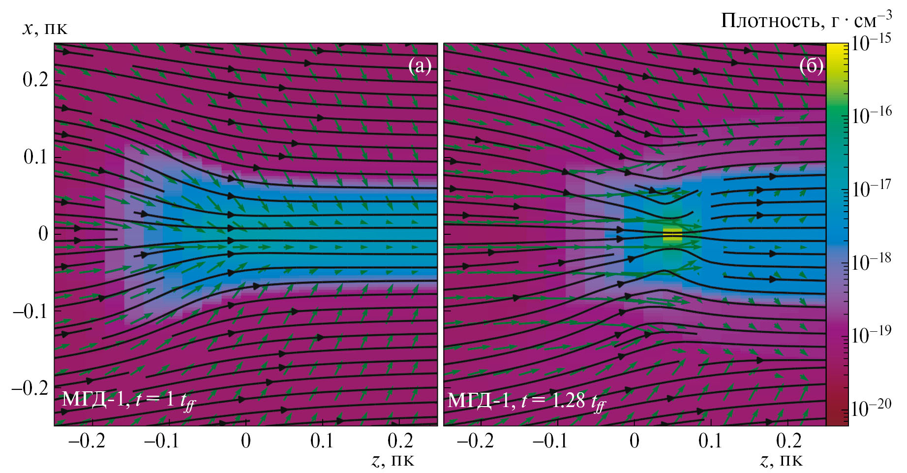 Рис. 5. Распределение плотности (цветовая заливка), поля скоростей (зеленые стрелки) и линий магнитного поля (черные линии со стрелками) в области формирования ядер в расчете МГД-1 в моменты времени t = 1tff (а) и 1.28tff (б).