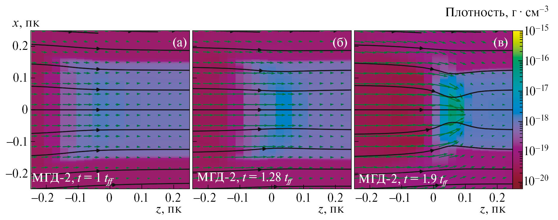 Рис. 2. Распределение плотности (цветовая заливка) и линий магнитного поля (черные линии со стрелками) волокна в плоскости x – ɀ в расчете МГД-1 в моменты времени t = 0 (а), 1tff (б), 1.28tff (в).