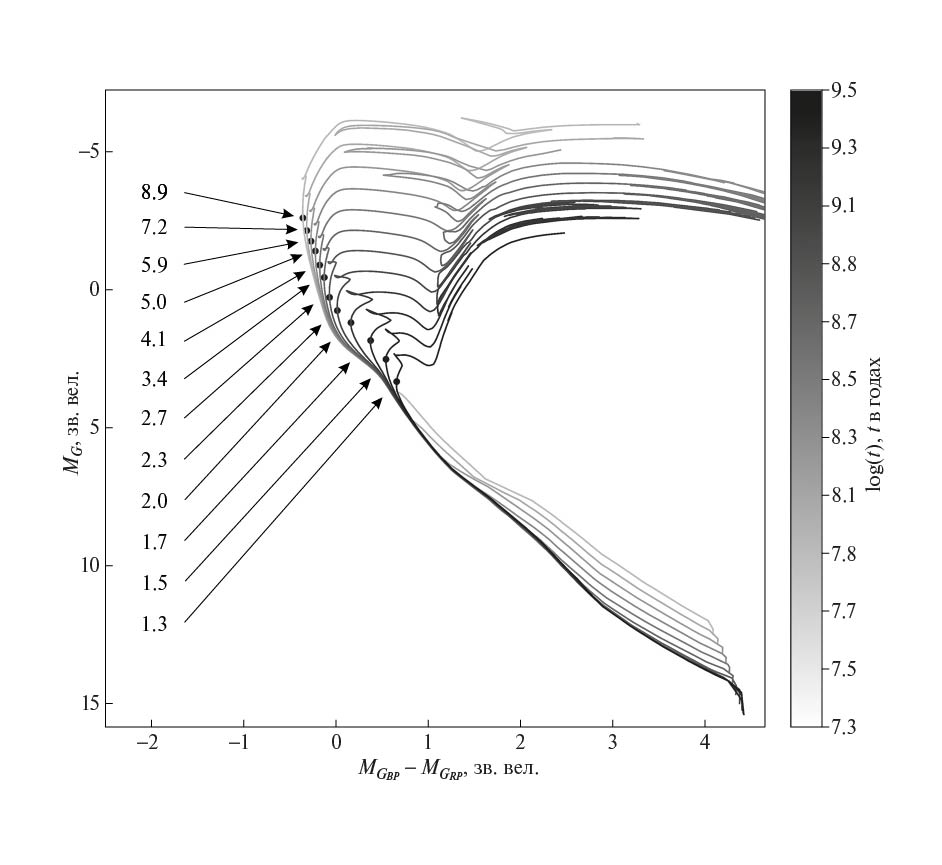 Наличие белых карликов можно ожидать в скоплениях старше 30 млн лет, в которых наибольшая масса звезд главной последовательности меньше верхнего предела, равного 8 [1]. На рис. 1 показаны изохроны PARSEC [29] разных возрастов с солнечным содержанием металлов, черные точки — положение точек поворота ГП. Каждой точке соответствует масса звезды в единицах массы Солнца, указанная стрелочкой. Возраст обозначен полутоновым градиентом.