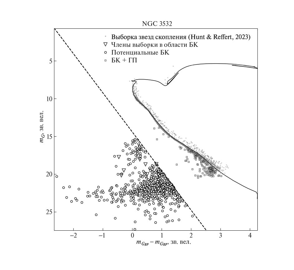 Предположим, что объекты, находящиеся под главной последовательностью, это неразрешенные двойные системы. Тогда, используя избранные звезды главной последовательности в качестве одного из компонентов, мы можем рассчитать положение на CMD второго компонента этих систем, применяя ту же методику. На рис. 3 рассчитанные для всех комбинаций вторые компоненты обозначены открытыми кружками. Область, занимаемая белыми карликами, согласно работе [15], отделена штриховой линией. Многие из них имеют звездные величины на грани обнаружения Gaia. Поэтому такие белые карлики не могли бы попасть в выборку [18]. Кроме того, возможно, что часть точек, расположенных под главной последовательностью, — результат ошибок метода отбора вероятных членов.