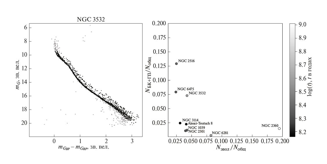 Рис. 4. Слева — диаграмма “звездная величина—показатель цвета” выборки скопления NGC 3532 в фотометрической системе Gaia [32]. Справа — соотношение содержания проэволюционировавших в БК объектов Nэвол/Nобщ и содержания двойных систем с белым карликом NБК+ГП/Nобщ; градиент показывает возраст рассматриваемых скоплений.