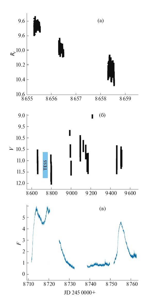 Точность полученных наблюдений зависит от погодных условий и составляет в среднем 0.01m–0.03m для наблюдений на Цейсс-2 и 0.02m–0.035m для наблюдений на АЗТ-5, т.е. она была примерно одинакова для обоих фильтров. Временно́й интервал между двумя последовательными измерениями выбирался в зависимости от того, на каком телескопе и с каким детектором проводились наблюдения. Для телескопа АЗТ-5 он составлял ~9 с, но различался для наблюдений на телескопе Цейсс-2 (так как во время наших наблюдений по независящим от нас причинам на телескопе использовались разные матрицы): ~6.7 с в июне 2019 и сентябре 2021 г., 8 с в ноябре 2019 г. и около 14 с в октябре 2020 г. Длительность индивидуальных pядов наблюдений (сетов) в течение ночи в основном сравнима с орбитальным периодом системы и в большинстве случаев составляет 6–7 часов. Всего за период с 2019 по 2021 гг. было получено 8647 наблюдений в фильтре Rc (3 сета) и 49 639 (22 сета) в фильтре V. Таким образом была создана база новых наблюдательных данных, относящихся к различным стадиям вспышечного цикла этой карликовой новой, что позволило нам провести количественный анализ наблюдений и сделать выводы относительно характеристик аккреционной структуры системы на различных этапах ее вспышечного цикла.