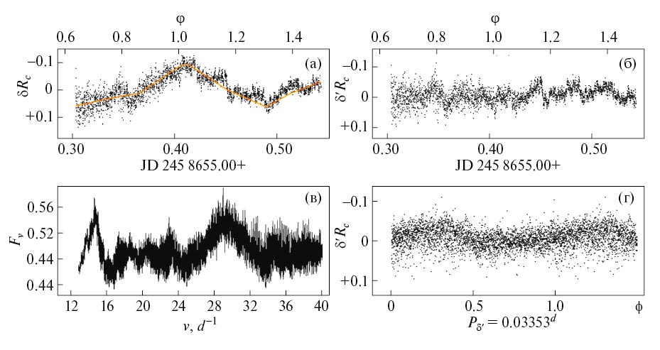 На обеих приведенных периодограммах присутствует общий пик на частотах νR = 3.6484 и νV = 3.6488 сут–1 (соответствующие значения периодов составляют PR = 0.274097d и PV = 0.274066d). Это на ~0.4% меньше значения, полученного в работе [42]. Различие в значениях периодов составляет ~0.01%, поэтому в дальнейшем для расчетов использовалось среднее значение