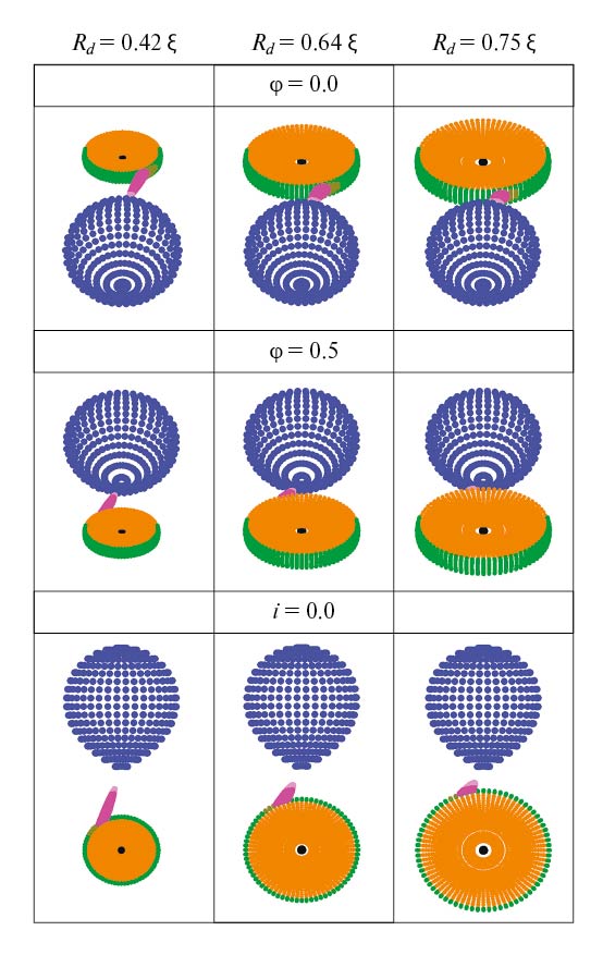Рис. 23. Схематичное изображение системы SS Cyg, построенное с параметрами из работы [43]: q = 1.5 и i = 52.5° для трех значений радиусов диска Rd = 0.42ξ, 0.64ξ и 0.75ξ в орбитальных фазах φ = 0.0 и 0.5. На нижней панели представлены изображения системы в картинной плоскости, i = 0° для φ = 0.0. Разными цветами показаны элементарные площадки на поверхностях: оптической звезды (синий), внутренней (оранжевый) и боковой (зеленый) частях диска, газового потока (малиновый), горячего пятна (коричневый) и белого карлика в центре диска (черный).