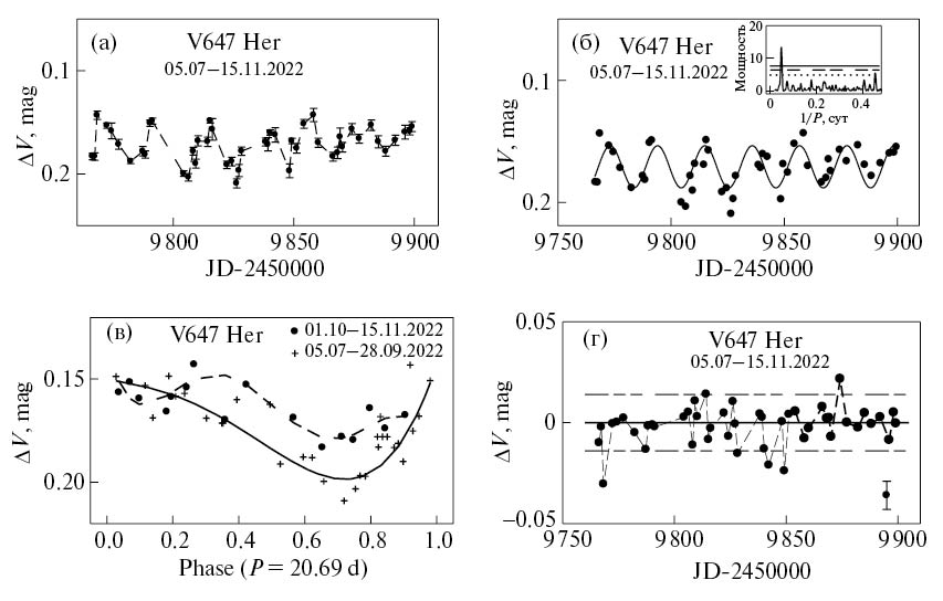 Рис. 3. Изменения блеска V647 Her с периодом 20.69 дней. (a) кривая блеска по наблюдениям 2022 г. и ошибки усредненных в дату наблюдения ΔV-величин; (б) изменения блеска V647 Her с периодом 20.69 сут, на вкладке — период 20.69 сут по результатам частотного анализа методом Ломба-Скаргля; (в) свертки данных на интервалах 05.07–28.09 (крестики) и 1.10–15.11 (зачерненные кружки), линиями приведены аппроксимирующие полиномы: (г) ряд остатков после вычитания вклада переменности с P = 20.69 сут и средняя квадратическая ошибка (ско) остаточных значений, пунктирами отмечены уровни ±2σ.