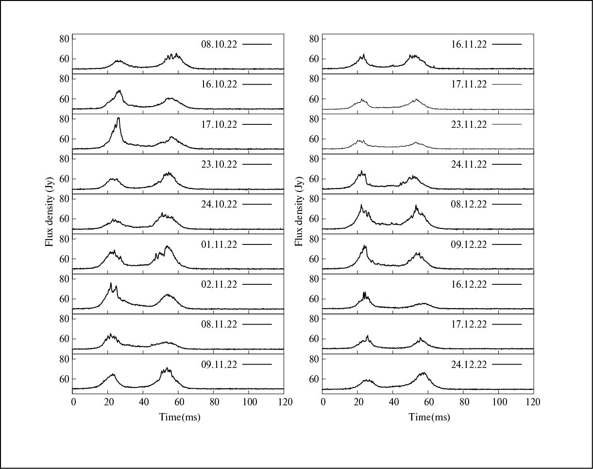 Когерентная дедисперсия, выполненная в частотной области, эквивалентна свертке функции импульсного отклика c сигналом во временно́й области. Однако деконволюция, выполненная в частотной области, приводит к циклической свертке [20]. В нашем случае реального сигнала и при дедисперсии, отнесенной к низкой частоте f0, первые k точек, соответствующие временно́му интервалу td, будут ошибочно умножены на данные, перенесенные с конца сегмента, и эти данные должны быть отброшены. Таким образом, при таком подходе первая часть сигнала будет потеряна на интервале td. Из непрерывной сырой записи мы выбрали окна длительностью 200 мс (один миллион отсчетов), разделенные периодом пульсара. В начале каждого такого окна 80 мс данных отбрасывались как искаженные циклической сверткой. Таким образом, у нас остались данные в окнах по 120 мс, которые и использовались в дальнейшем. Примеры среднего профиля для отдельных сеансов наблюдений приведены на рис. 1. Мы оценили эквивалентную плотность потока, соответствующую шумам фона и приемной системы (SEFD) в направлении на пульсар B1133+16, равной 50 Jy. Точность этой оценки составляет около 25%.