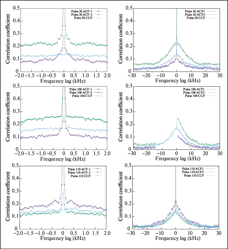 Пульсар B1133+16 — очень яркий пульсар, и также благодаря высокой чувствительности антенны БСА мы зарегистрировали много сильных импульсов. Поэтому была возможность исследовать мерцание в режиме моментального снимка по отдельным импульсам. На рис. 6 показаны три импульса, достаточно яркие в обоих компонентах среднего профиля. Спектры мощности рассчитывались отдельно для двух компонентов в окнах длительностью 16 мс с центром на долготе максимума соответствующих компонентов. Для этого случая получается спектральное разрешение 65.2 Гц. Затем рассчитывались автокорреляционные функции для каждого спектра и взаимные корреляционные функции между спектрами для первого и второго компонентов среднего профиля. На рис. 7 показаны все эти функции в двух частотных шкалах: левые панели отображают данные в узком диапазоне частот (±2 кГц), а правые панели охватывают частотный диапазон ±30 кГц. Оказалось, что автокорреляционные функции имеют короткомасштабные компоненты шириной менее килогерца; эти детали отсутствуют в функциях взаимной корреляции. Мы полагаем, что эти узкополосные детали возникают в результате модуляции спектра огибающей импульса и не относятся к мерцательному процессу. Действительно, узкочастотные детали (100–200 Гц), видимые на левой панели рис. 7, различаются для разных компонентов среднего профиля. Частотные ширины этих структур хорошо согласуются с характерной длительностью субимпульсов (5—10 мс, рис. 6).