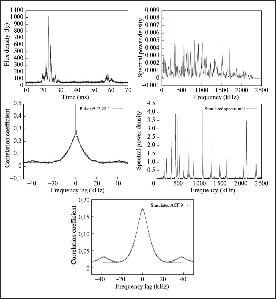 Рис. 8. Результаты численного моделирования спектров. Верхний левый рисунок — индивидуальный импульс, зарегистрированный в сеансе 9 декабря 2022 г. под номером 58; верхний правый рисунок — спектр мощности для этого импульса (первый компонент); в середине слева приведена ACF для спектра мощности импульса № 58; в середине справа показан смоделированный спектр; в нижней части рисунка дается ACF от смоделированного спектра.
