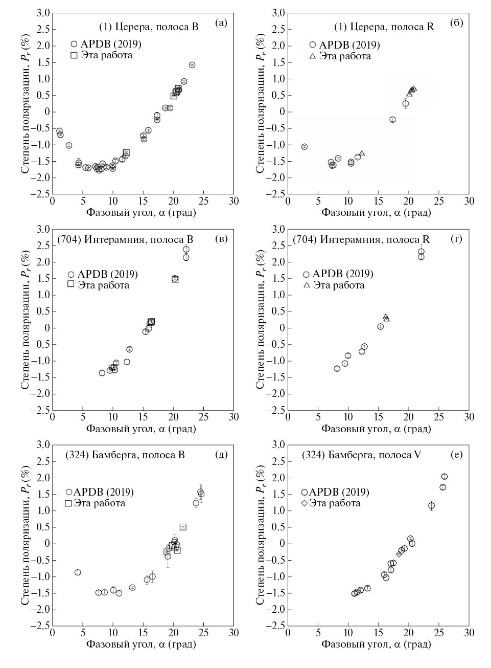 На рис. 1(а)–(е) показаны результаты наших измерений степени поляризации астероидов в полосах B, V и R вместе с данными разных авторов, взятых из каталога APDB [16].