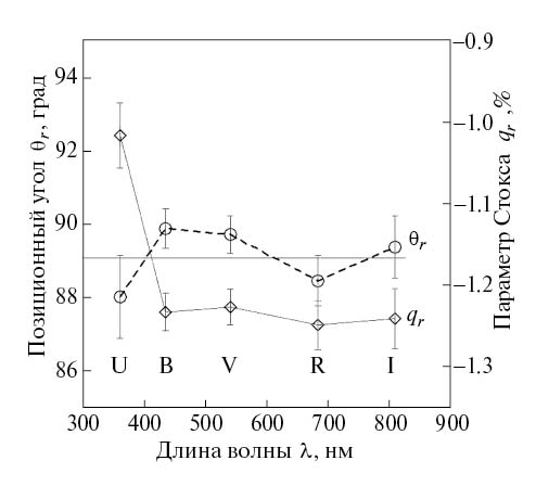 в экваториальной системе координат, где ΔPA — поправки к нуль-пунктам инструментальных позиционных углов. Для определения поправок ΔPA проведены наблюдения звезд-стандартов с известной высокой степенью поляризации и известными углами поляризации в экваториальной системе координат, взятые из [11, 12]. Поправки за нуль-пункты инструментальных позиционных углов во всех фильтрах были постоянны в пределах ±3°. Более подробно поляриметр, методики наблюдений и обработки данных описаны в работе [13].