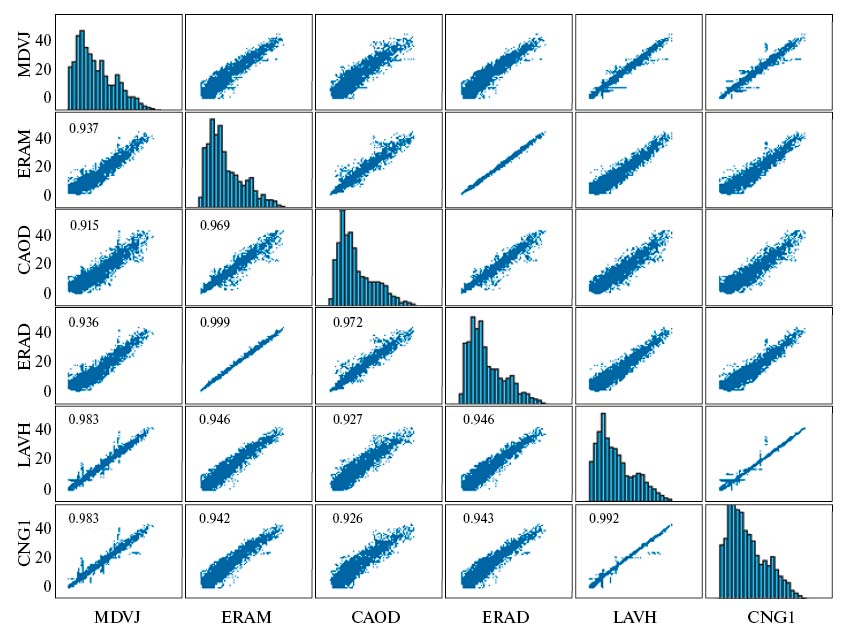 Рис. 3. Диаграмма рассеяния коэффициентов корреляции Пирсона для осажденного водяного пара за 2021 г. На рисунке показаны значения PWV [мм], определенные по различным данным. По диагонали приведены гистограммы, описывающие распределения согласующихся во времени коэффициентов Пирсона корреляции между значениями осажденного водяного пара PWV. MDVJ — Менделеево, LAVH — ГБУ Мосгоргеотрест, CAOD — станция радиозондирования в Долгопрудном, CNG1 — Центр геодезии, картографии, ERAM и ERAD — узлы сетки реанализа, ближайшие к Менделееву и Долгопрудному.