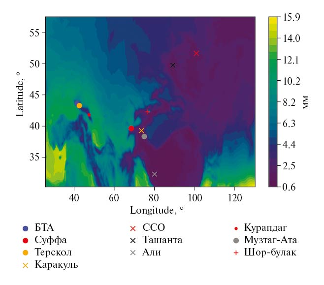 На основе анализа пространственных распределений осажденного водяного пара и доли общей облачности, усредненных для ночного времени за период с 2013 по 2022 г., выявлены оптимальные пространственные области с высокими астроклиматическими показателями. Показано, что области с пониженным содержанием водяного пара в тропосфере — нижней стратосфере, вытянутые преимущественно в меридиональном направлении, и низкой долей покрытия общей облачностью включают в себя места расположения Саянской Солнечной обсерватории (пик Хулугайша) и АПП Ташанта. На Северном Кавказе высокие астроклиматические показатели демонстрируют пункты горного Дагестана (в качестве референсных пунктов нами выбраны г. Курапдаг, г. Хорай и вершины плато Гуниб). Одни из лучших астроклиматических показателей демонстрируют астропункты, находящиеся в обширной области пониженных значений PWV, соответствующие темно-синему цвету на рис. 4. Наилучшие астроклиматические условия в терминах TCC и PWV наблюдаются над астропунктом Али на плато Тибет в Китае. В пределах этой обширной области следует отметить такие пункты с высокими астроклиматическими показателями, как Музтаг-Ата, озеро Каракуль и Шор-Булак.