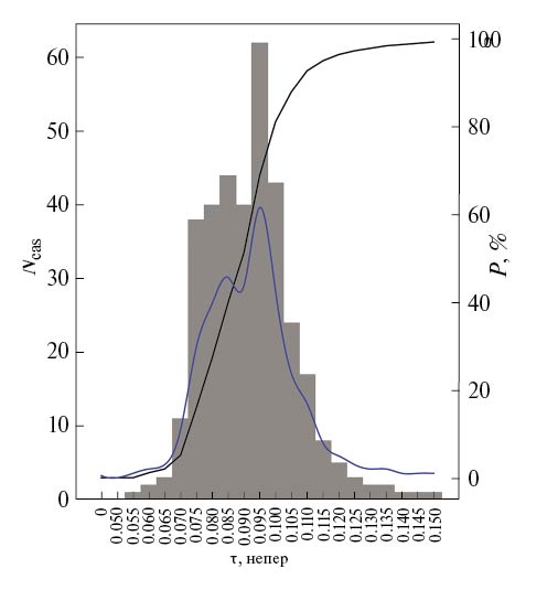 Рис. 7. Функция вероятности повторяемости значений оптической толщи для длины волны излучения 3 мм, полученная по данным радиометрических измерений, адаптированная из работы Бубнова [34], для места расположения Большого телескопа азимутального. Черная линия соответствует накопленной вероятности повторяемости, синяя линия — ядерной оценке плотности распределения.