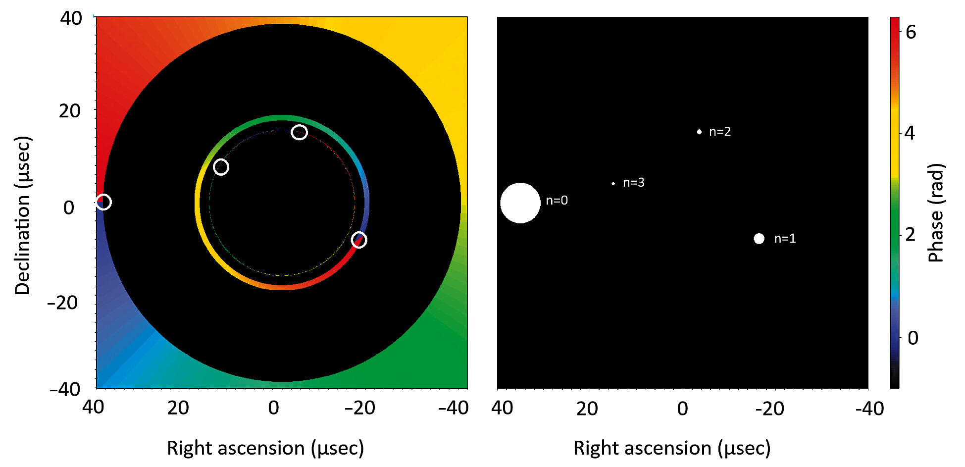 Предположим, что в ближайшей окрестности СМЧД произошла компактная вспышка в миллиметровой области спектра с продолжительностью t >> tph [11]. Тогда наблюдатель увидит суперпозицию вспышек в аккреционном диске и их эха в фотонных кольцах. Другими словами, каждая вспышка вблизи СМЧД будет отображаться на экране наблюдателя в виде последовательности нескольких одновременных вспышек. Возможное расположение вспышек показано слева на рис. 1. Расположение вспышек в фотонных кольцах зависит только от спина черной дыры и угла наклона наблюдателя к ее оси вращения, и не зависит от массы черной дыры. Если бы черная дыра не вращалась, т.е. описывалась бы метрикой Шварцшильда, то и вспышка в аккреционном диске и все ее отражения в фотонных кольцах располагались бы на одной прямой. В этом случае угол между вспышками составлял бы 180°. В случае вращающейся черной дыры, задаваемой метрикой Керра, изображения вспышек в фотонных кольцах перестают располагаться на одной прямой и угол между ними определяется параметром вращения черной дыры (спином). На правой панели рис. 1 показана геометрическая форма вспышки и ее отражение в фотонных кольцах (для случая вращающейся черной дыры с параметром вращения близким к a ≈ 1). Предполагается, что изначальной формой вспышки в аккреционном диске является круг.