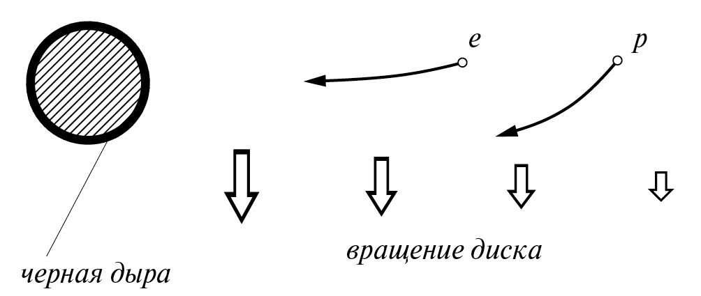 Рассмотрим движение потока частиц, падающих на центр аккреционного диска (например, черную дыру). Можно предполагать, что электроны намного сильнее взаимодействуют с излучением, идущим от ядра галактики, чем протоны. По этой причине вращательная скорость электронов сильно уменьшается, и в первом приближении можно ею пренебречь [19]. В то же время движение протонов будет подчиняться следующему уравнению [15, 16]: