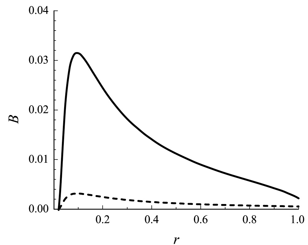 Рис. 3. Магнитное поле для Rmin/Rmax = 0.02. Сплошная линия соответствует α = 102, штриховая — α = 103