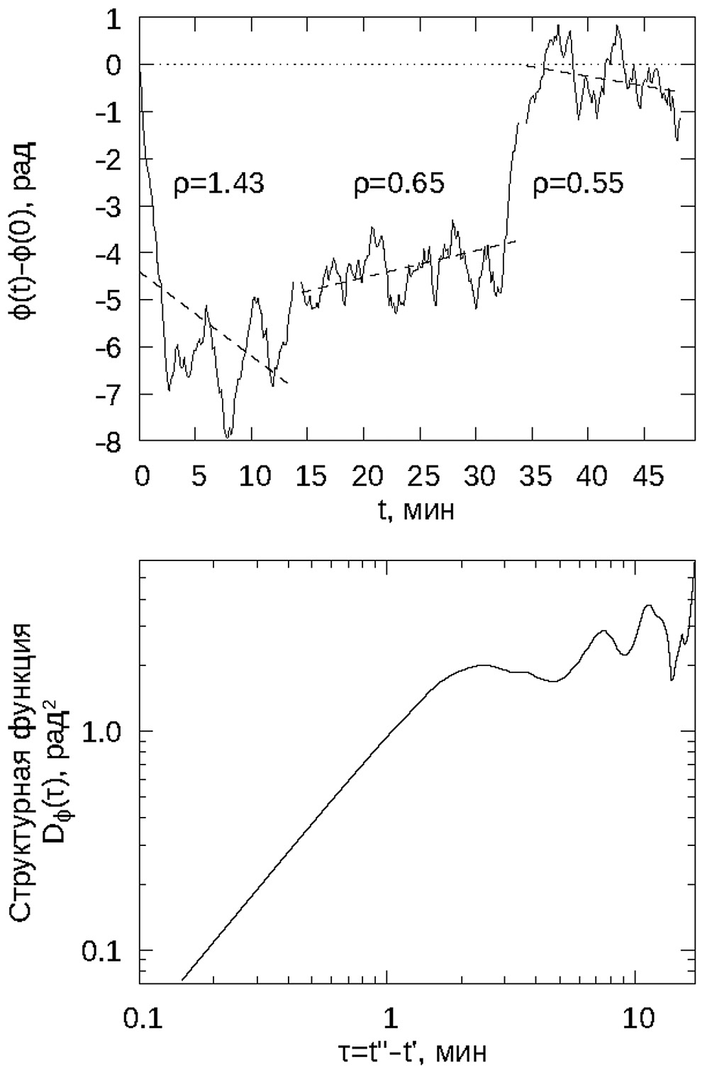 Рис. 3. Верхний график: зависимость атмосферного вклада в вариацию фазы кросс-спектра φatm от времени (сплошная линия), его аппроксимация линейными функциями времени на каждом скане (штриховые линии) и значения ρ — среднеквадратичных отклонений линейной аппроксимации от наблюдений. Нижний график: структурная функция Dφ(τ)