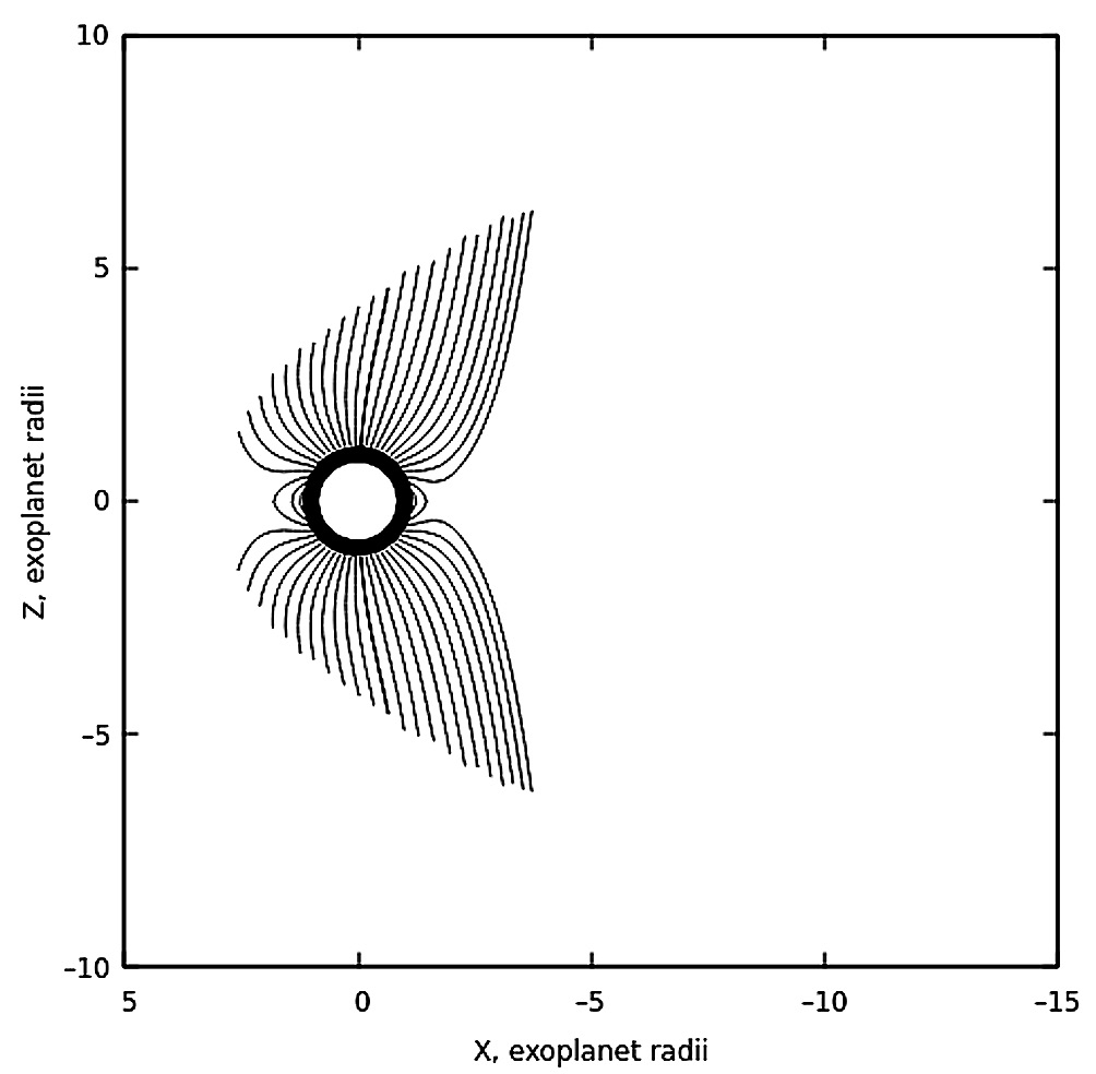 На рис. 1 показано сечение магнитосферы экзопланеты HD 209458b полдень-полночь для умеренного (относительно слабого) ММП. При этом альфвеновское число Маха очень большое, и получается кометообразная магнитосфера с головной ударной волной, не показанной на рисунке. Замкнутые силовые линии идут из одного полушария ионосферы в другое, пересекая экватор. Открытые силовые линии пересекают магнитопаузу и вытянуты в далекий хвост. При ММП, равном нулю, они нигде не пересекают магнитопаузу, уходя в торец хвоста. В долях хвоста направления магнитного поля противоположны в северном и южном полупространствах, этому соответствует ток в экваториальном хвосте (нейтральный токовый слой).